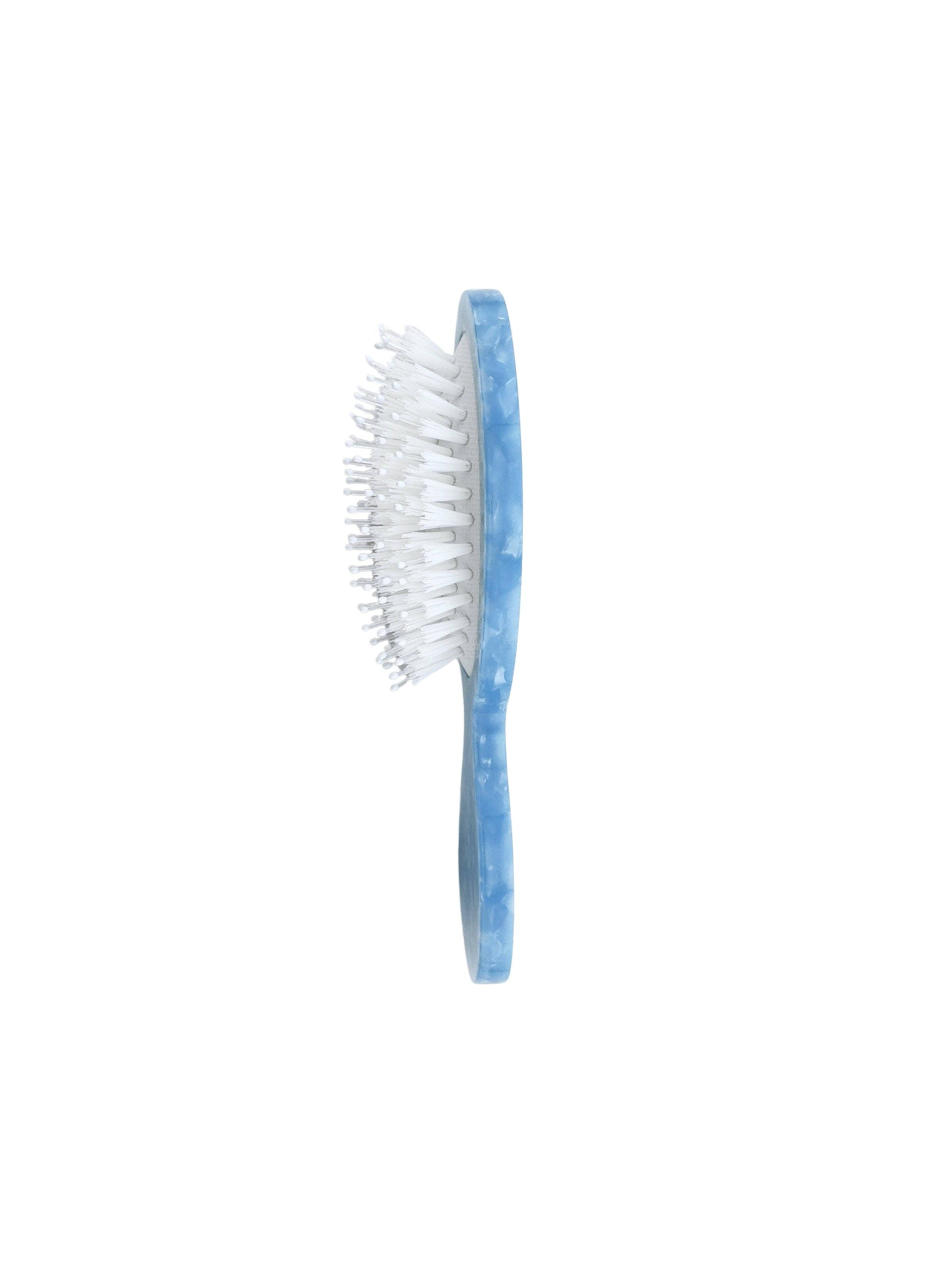 Vegan boar-like bristles distribute natural oils and smooth hair, while flexible pins gently detangle and massage the scalp.