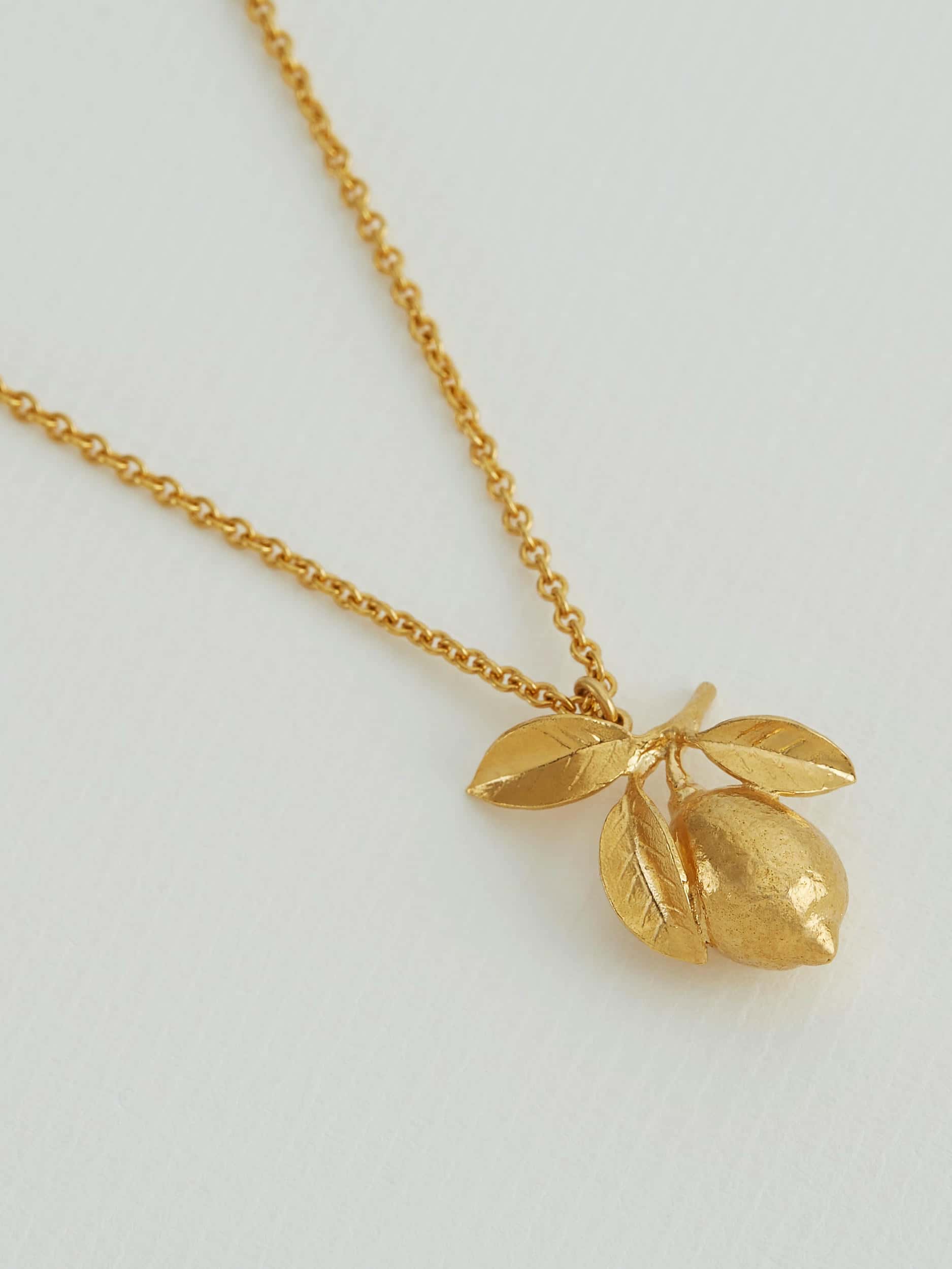 A carefully textured lemon hangs below sculptural leaves, creating a signature pendant necklace - looking perfectly ripe and zesty. This style comes on an extendable 20 -22’’ heavier gauge chain, making it a perfect layering piece. Handmade in Sterling Silver and plated with Fairmined Gold.