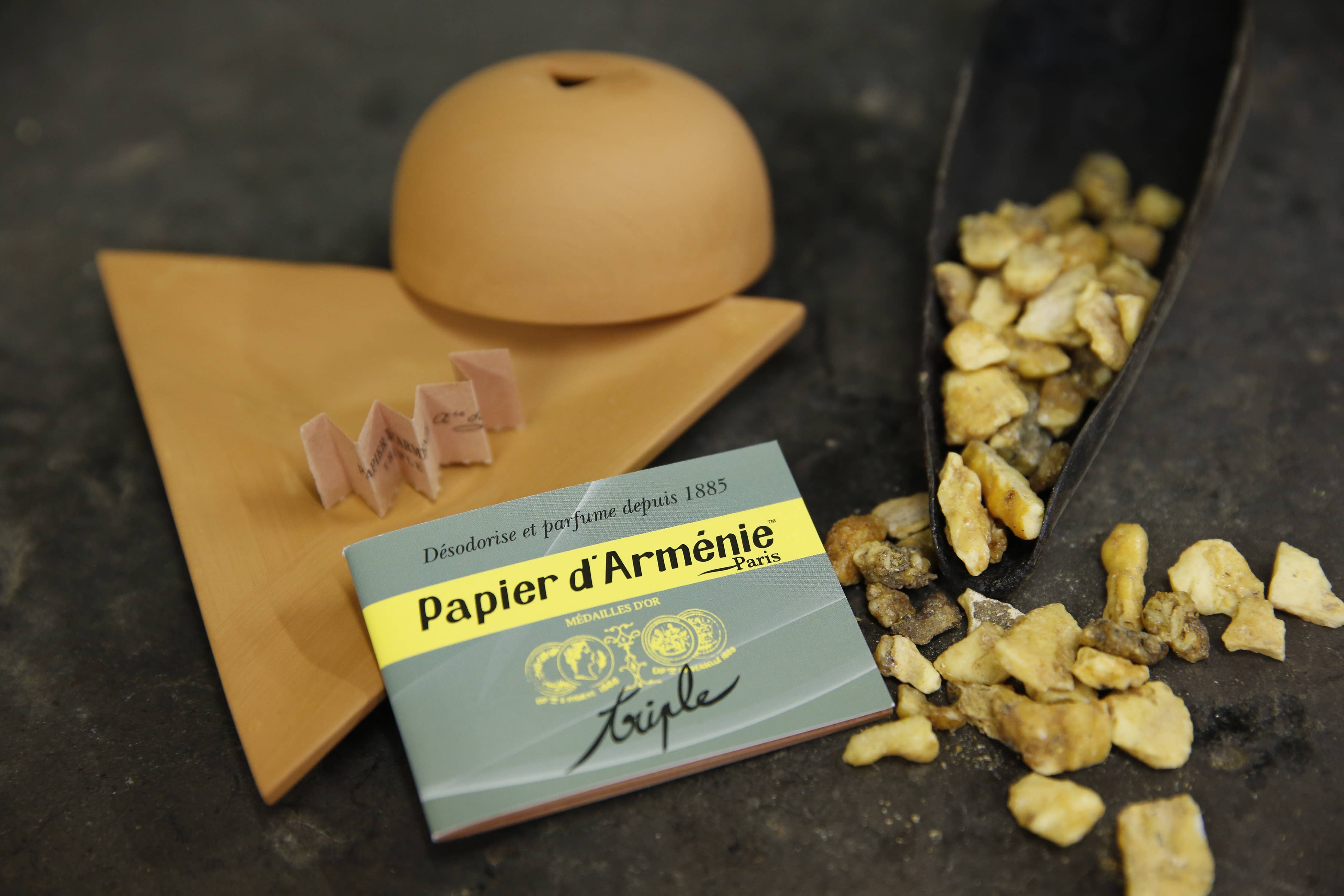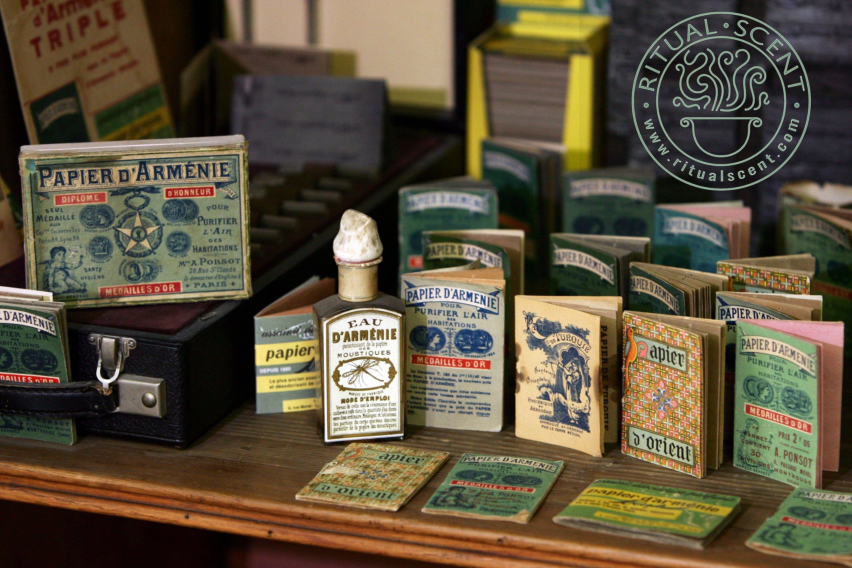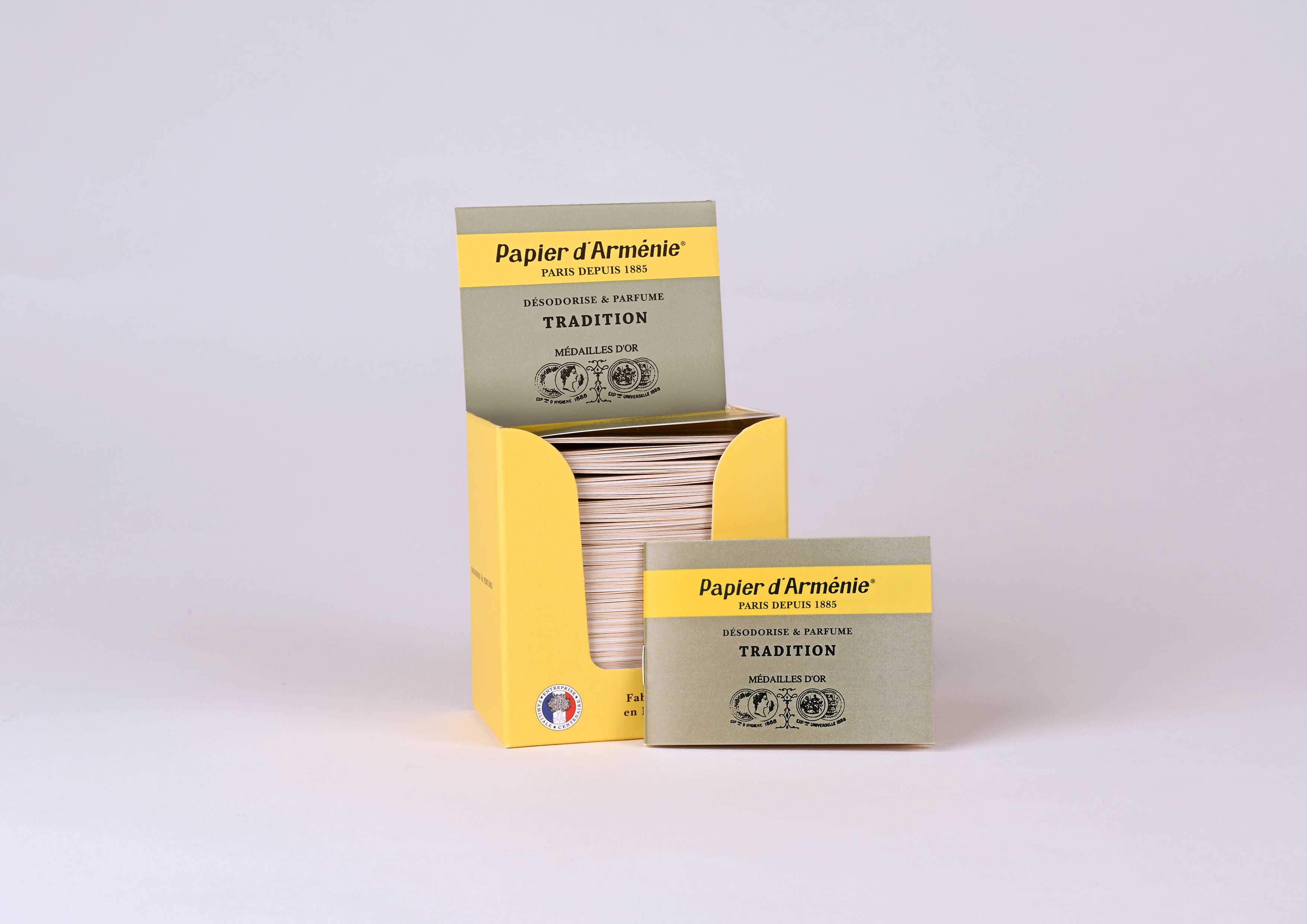 Papier d'Arménie Incense Papers - TRADITION - original scent. Papier d'Arménie incense paper was created more than 120 years ago and is a respected and much-treasured part of Parisian life. These are famous fragranced paper booklets that have been hand soaked in a process that takes more than 6 months. Each booklet contains 36 detachable strips of perfumed paper. To use, tear out a strip, fold it into a fan or concertina pattern, and place it in a burner or other container such as an ashtray. Light one end of the paper and it will begin to smolder, gently emitting an incredible fragrance that is based on a traditional recipe of resins, including benzoin. The smoke clears the space, it acts as a beautiful deodorizer and uplifts the mood. These strips have been a secret to maintaining an amazing atmosphere in French homes for more than a century.