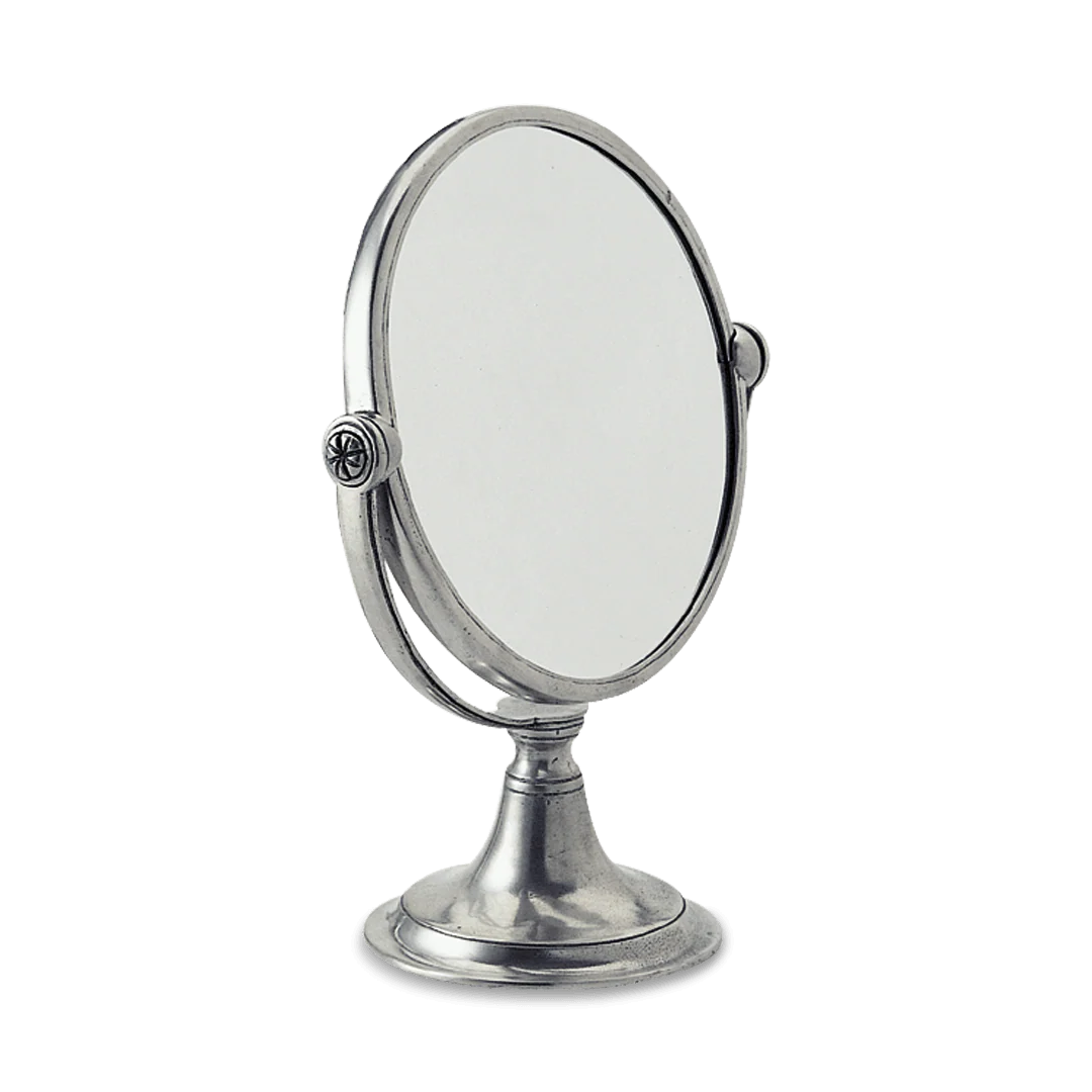 Double sided to bring out the real you! One side features 3x magnification. The perfect pewter vanity mirror for make-up, a close shave, or checking that winning smile.