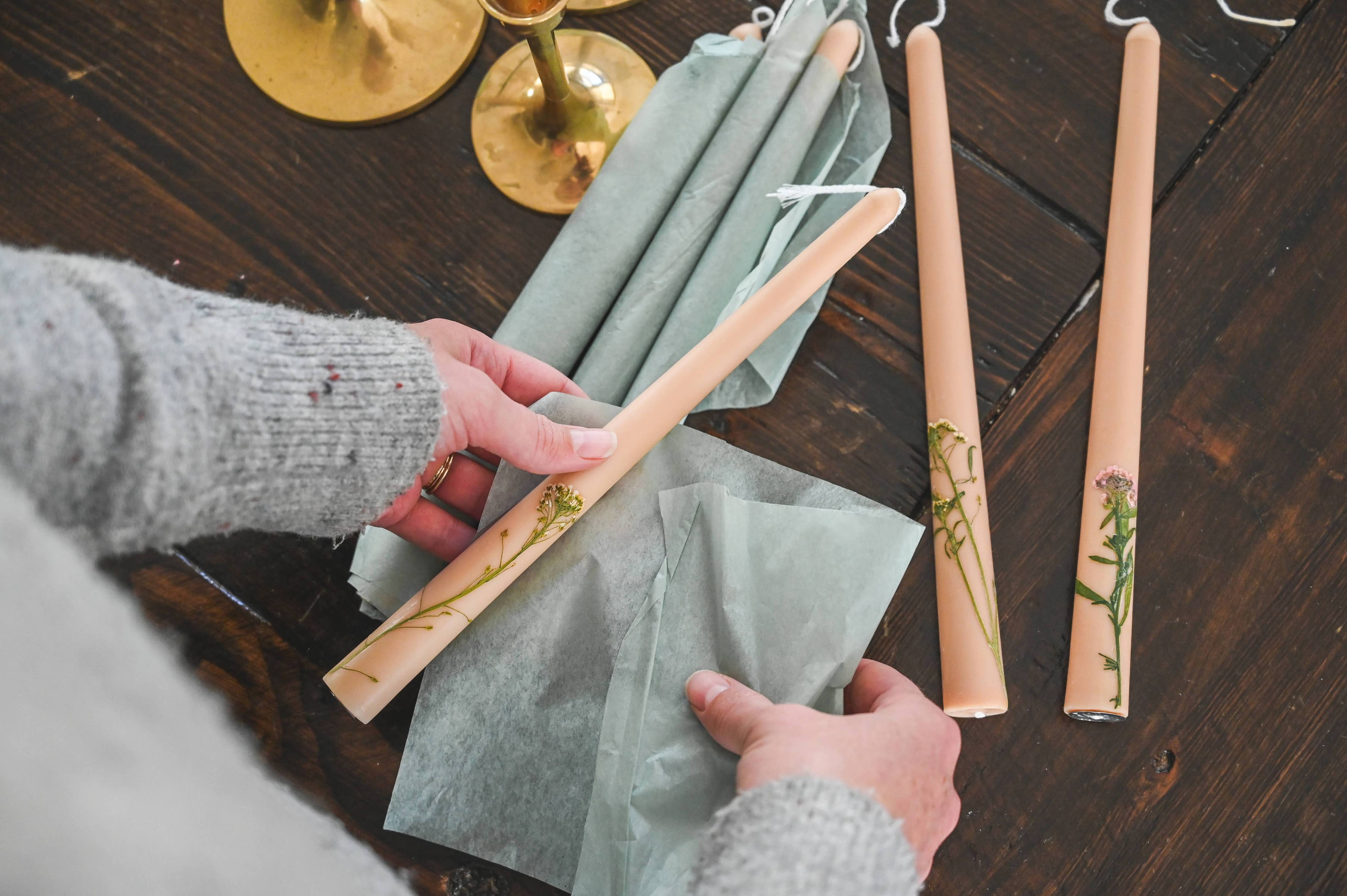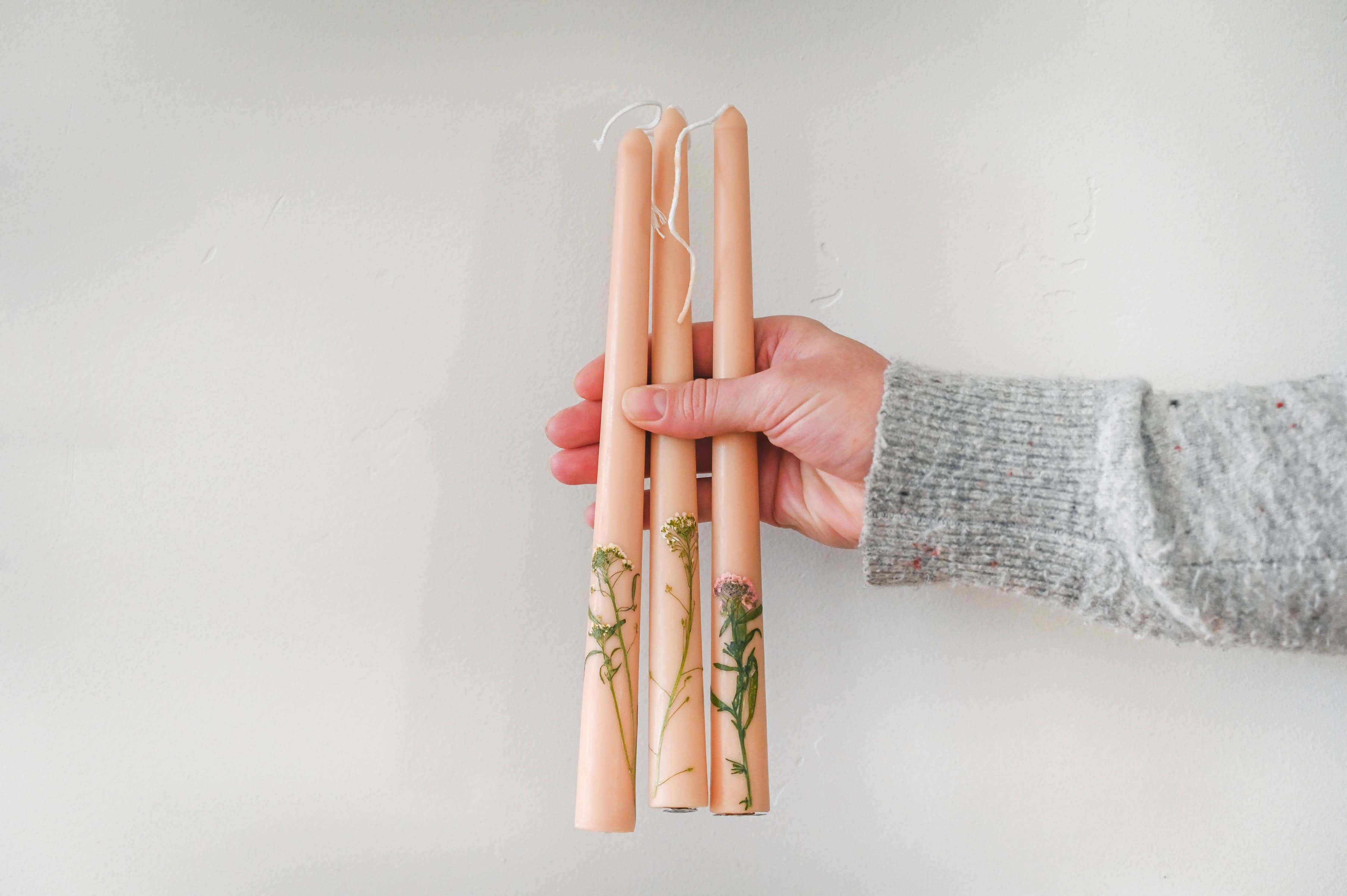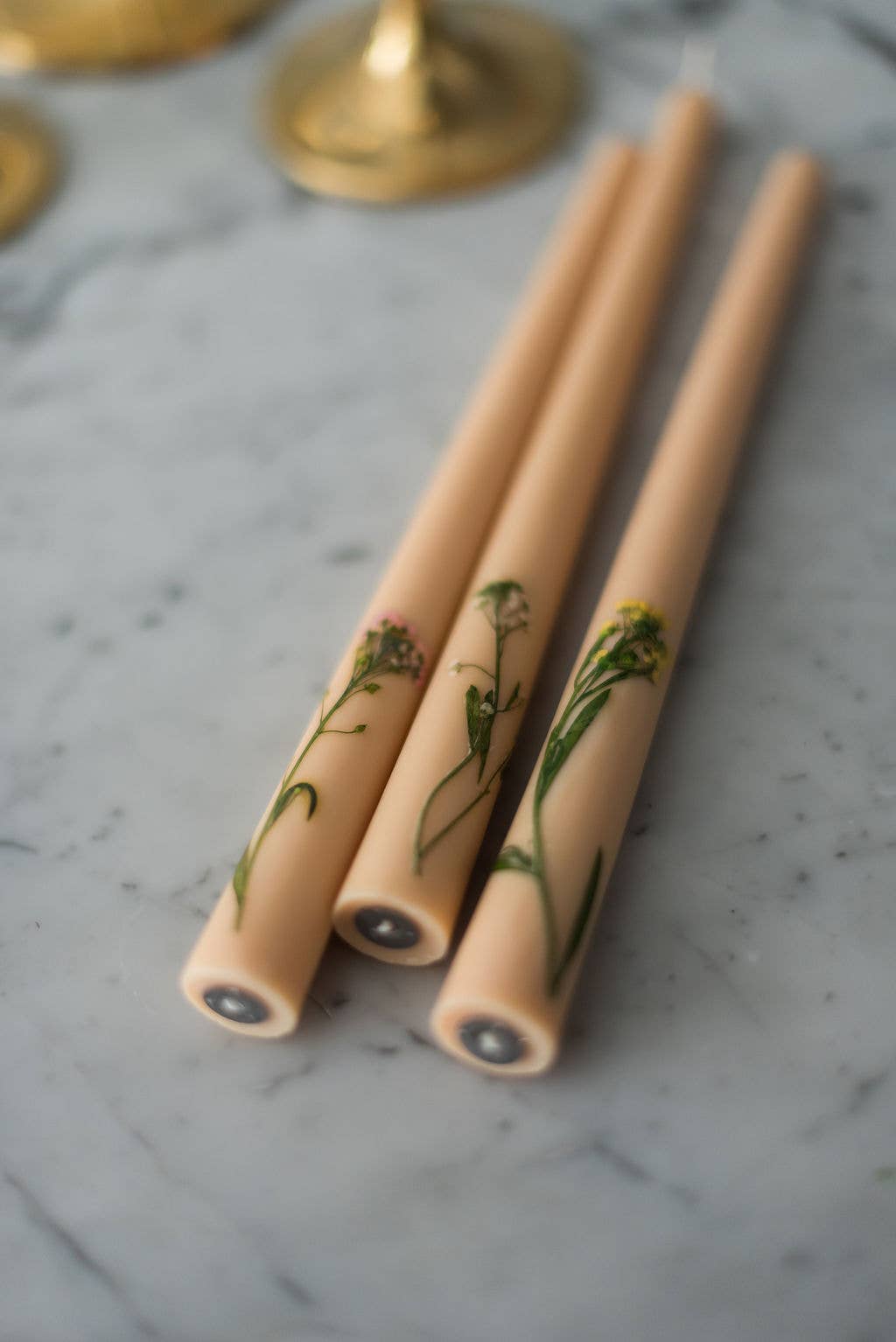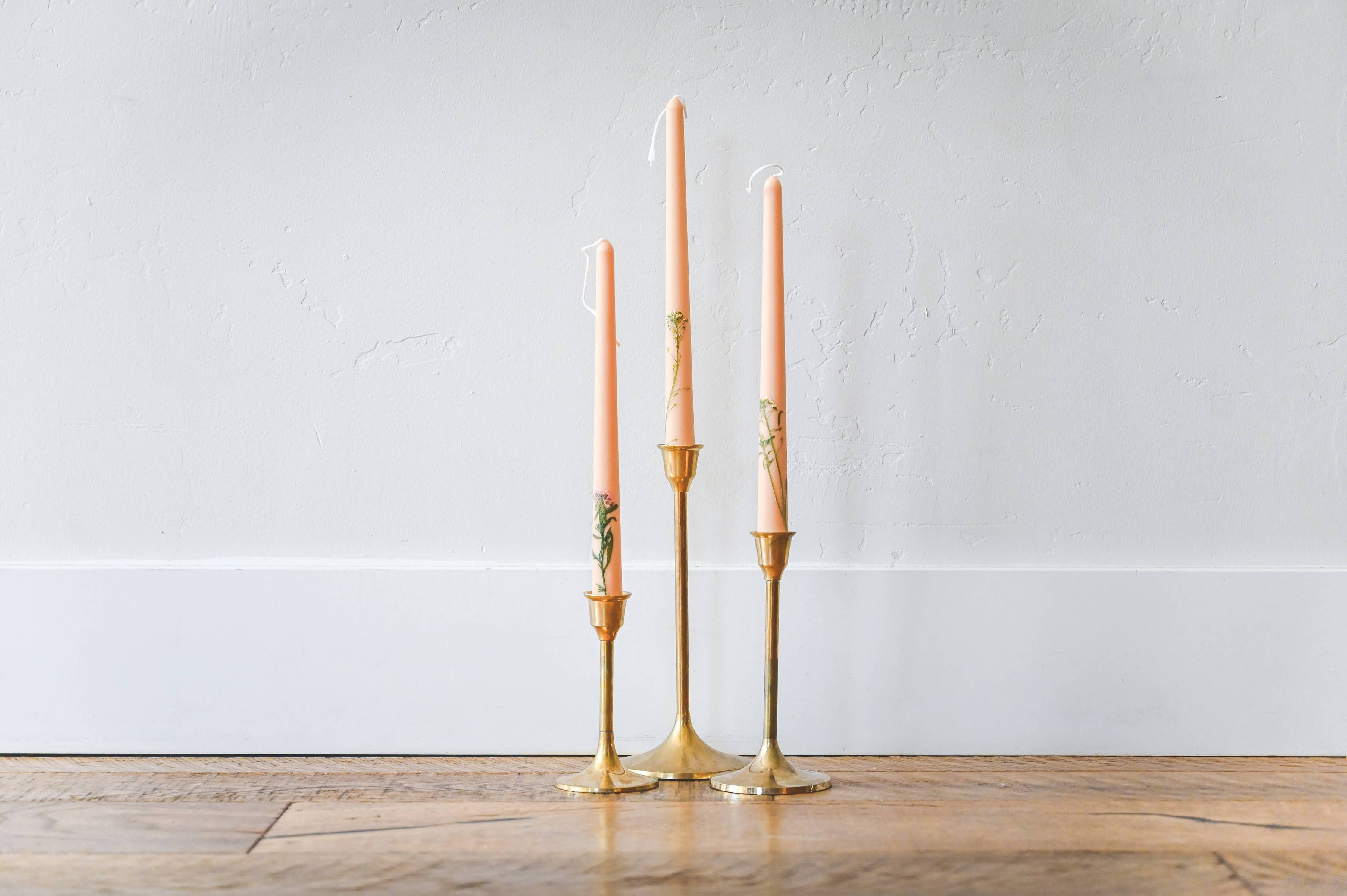We searched and weren’t able to find floral inlaid tapered candles, so we created them! A set of three soy and beeswax candles that fit perfectly in our brass candle holders. The florals in each candle are real flowers that have been dried and placed in the wax candle. In each set of candles comes with a pastel pink, a cream, and a soft yellow flower.