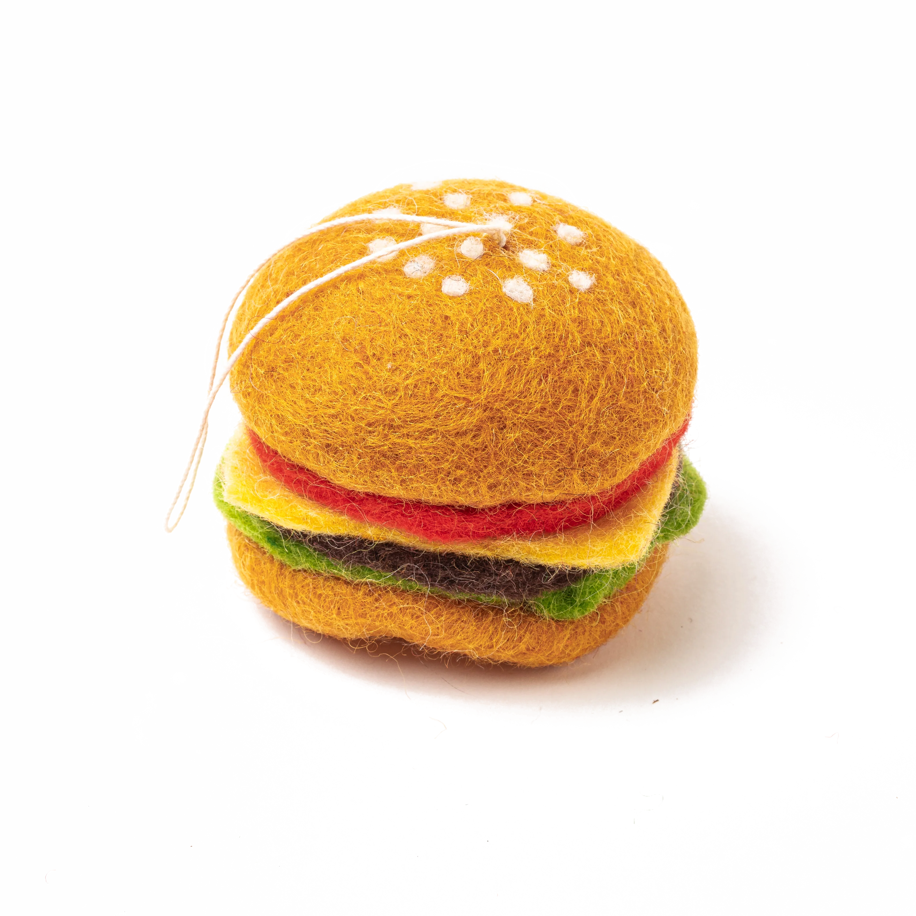 Just look at those slices of cheese, patty, tomato and lettuce on this sesame seed bun. We could almost make a jingle out of this ornament! Grab the whole set or add a taco, hot dog, pizza or bagel at your own pace. Every ornament is beautifully handmade by women artisans in Nepal, where we partner with women-led cooperatives and provide fair living wages and sustainable incomes. 100% New Zealand sheep's wool Azo-free non-toxic dyes 2.75” long x 3” wide, 3” hang