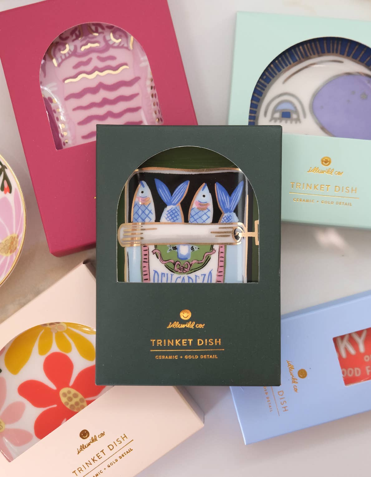 A fan favorite giftable–Our ceramic trinket dishes are the perfect catchall for your nightstand or dresser. White ceramic is adorned with our colorful, hand-painted designs, and we lined the edge in 10k gold for added flair. Perfectly packaged in plastic-free gift boxes, pretty enough to give without wrapping!