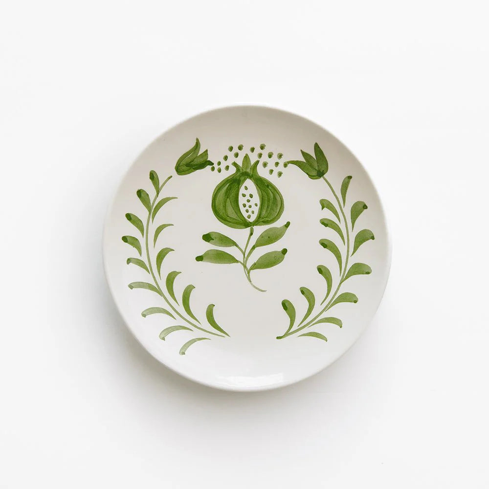 Delight your guests with these charming hand-painted ceramic Pomegranate Crest Green Appetizer Plates. Pomegranate's collection of hand-painted ceramic dinnerware is whimsical, sophisticated and fun! Made to mix and match with our Ruffled Ceramic Dinnerware collection or pair as a full set, each plate is beautifully adorned with a hand-painted pomegranate motif, framed by intricate green vines and arches. These plates offer the perfect size for serving appetizers, snacks, tapas, or small desserts while adding a vibrant yet elegant touch to your table.