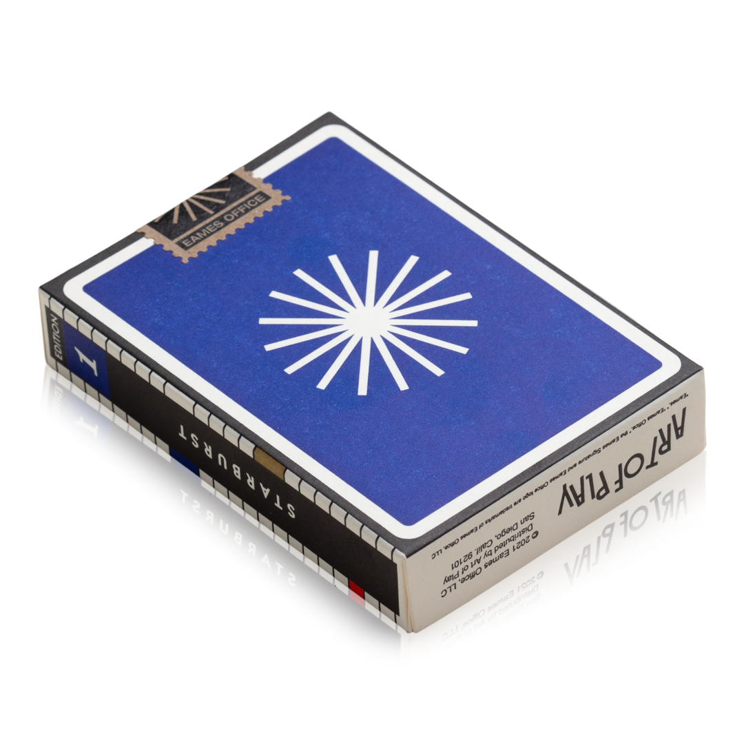 Our first edition of Eames Playing Cards showcases the Eames Office Starburst Logo on the backs. This iconic emblem was a recurring motif in the work of both Charles and Ray. Here it signifies their boundless creative energy—an explosion of light reaching for the outer limits of design's true purpose. The unique numbering system on the faces of the cards enables acts of cardistry to function as subtle homages to the Eameses' classic film “Powers of Ten." The court cards honor the natural majesty they found in elemental geometric shapes.