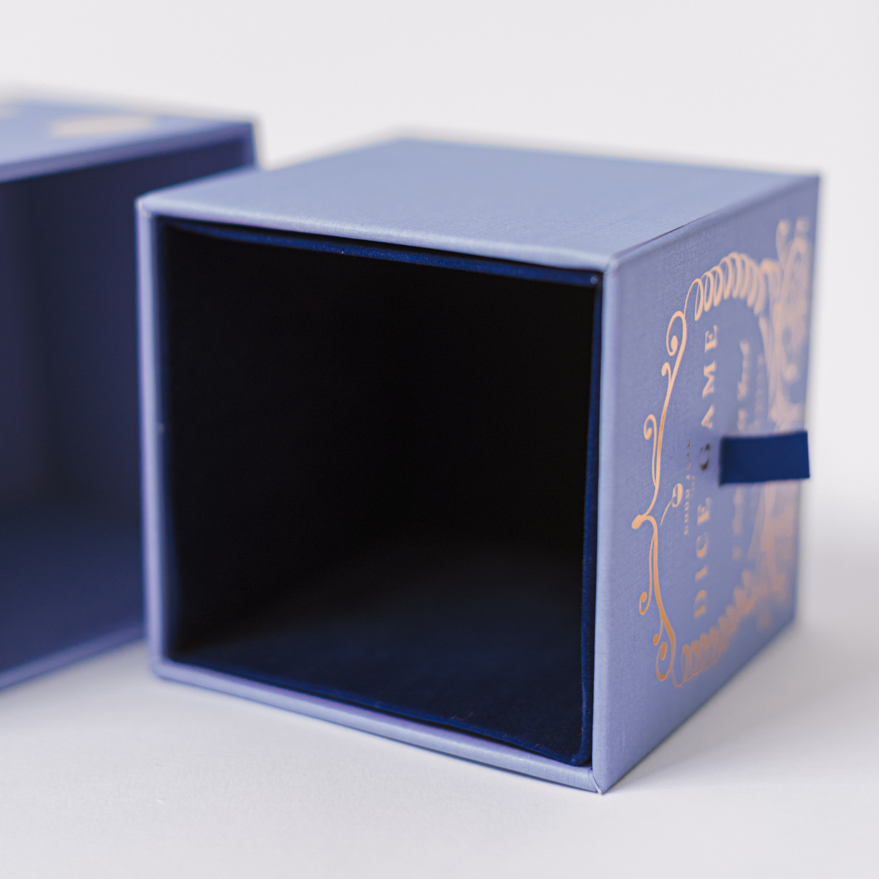 Set features a velveteen foil stamped bag to hold dice and a velveteen lined, die-shaped box that doubles as a dice up. Set includes:
