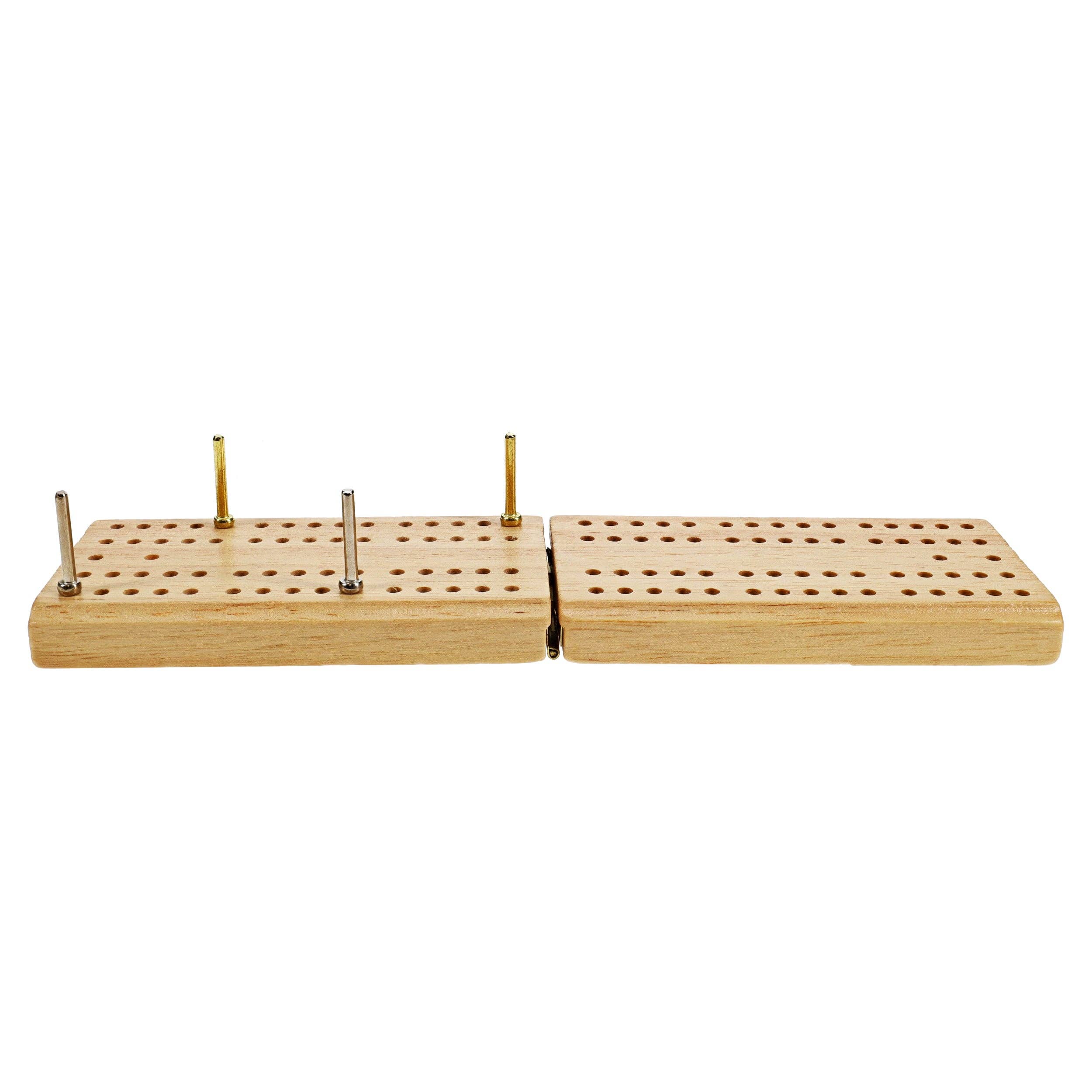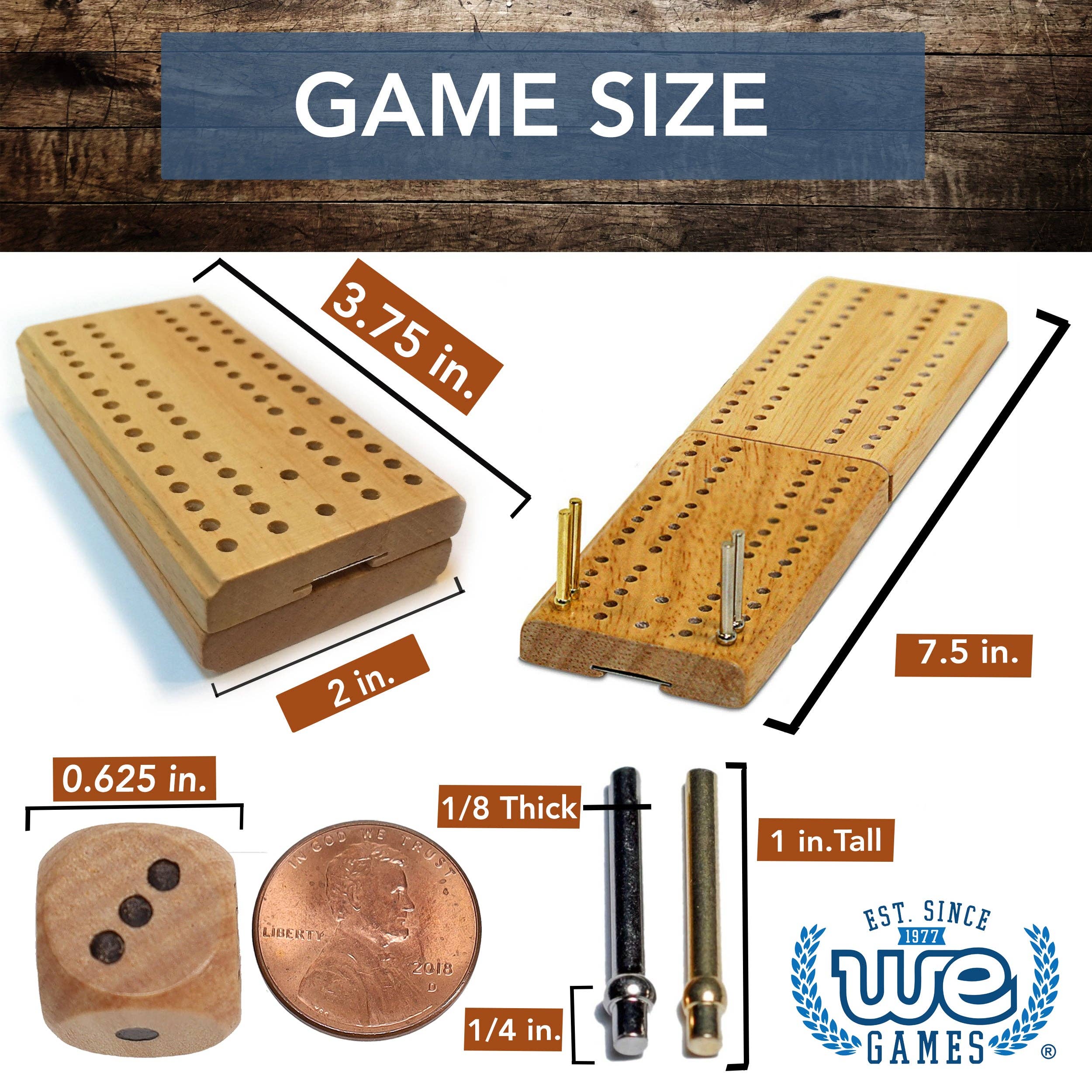 From cribbage to poker, and even solitaire, this small game set is a must-have while traveling or camping. With over a dozen games that can be played from this small travel set, the hours will pass fast while having fun. The cribbage board has two tracks, folds in half, and has a storage space for the metal scoring pegs. Comes with five wooden dice and a poker card set that is plastic coated for high durability. The entire set can be stored in the included cloth bag for convenient travel.
