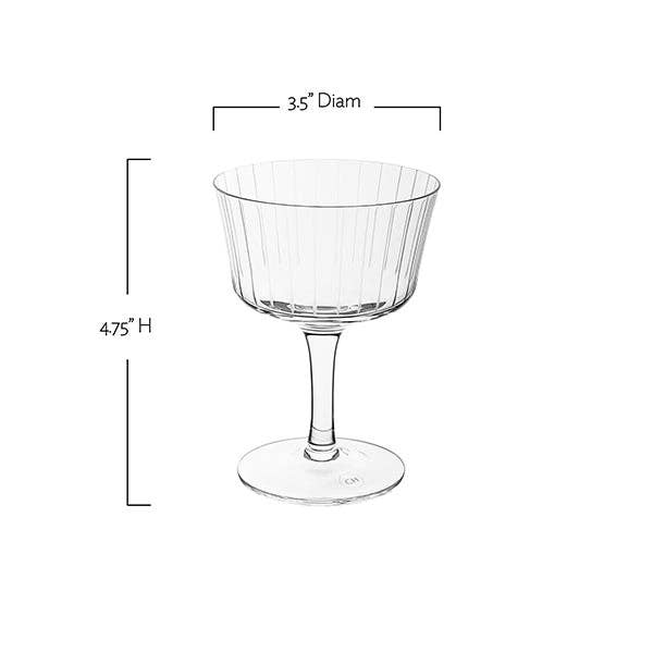 Etched Coupe Glass Inspired by nature, beautiful botanical designs are engraved into super thin soda glass. The Sienna glasses have a weightless and timeless elegance. EDITCOPY Details * Imported * Delicate Linear Etching * Material: Glass * Color: Clear *  * 3.5" Diam x 4.75" H * 8 oz General Care * Dishwasher Safe * Hand Wash Recommended