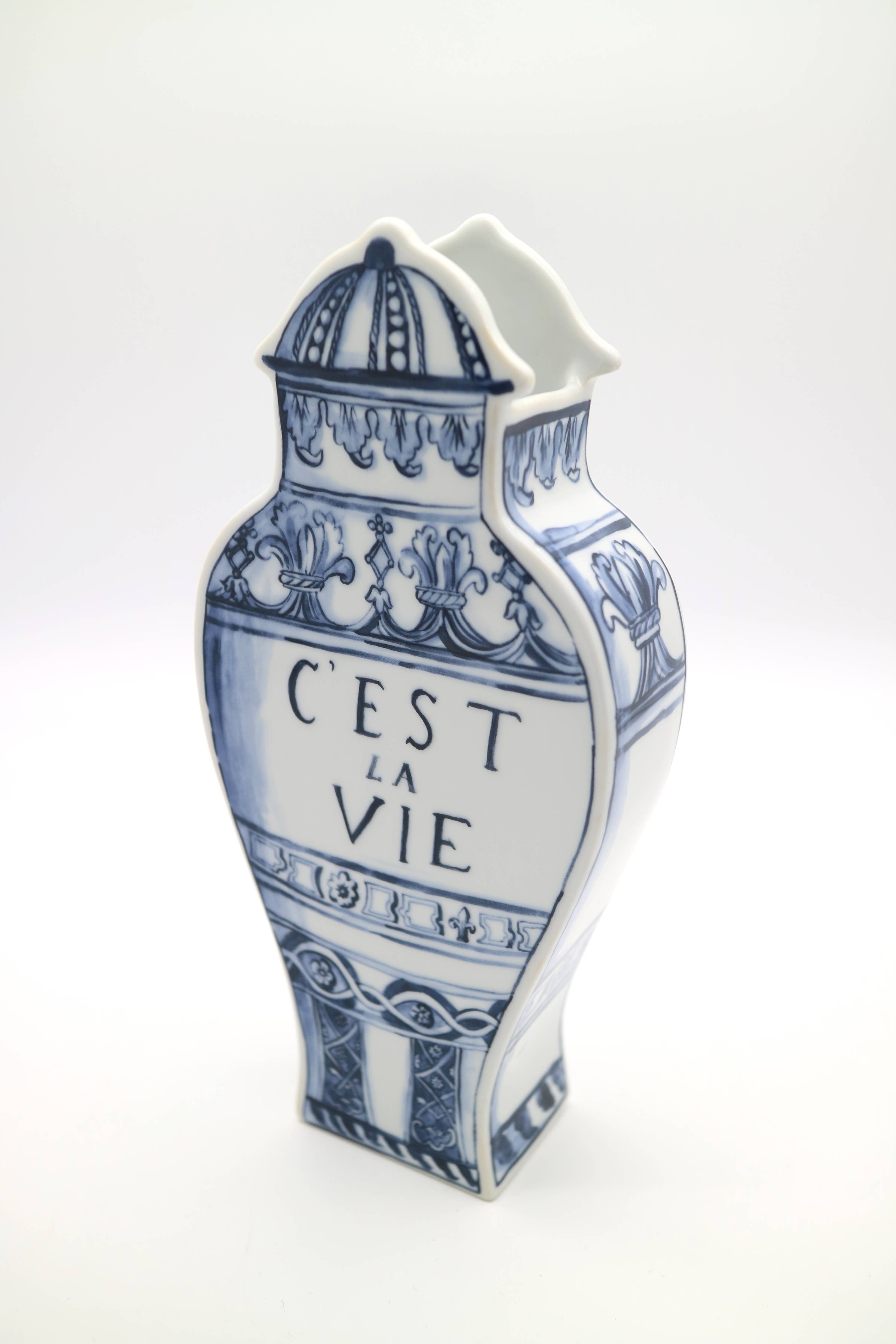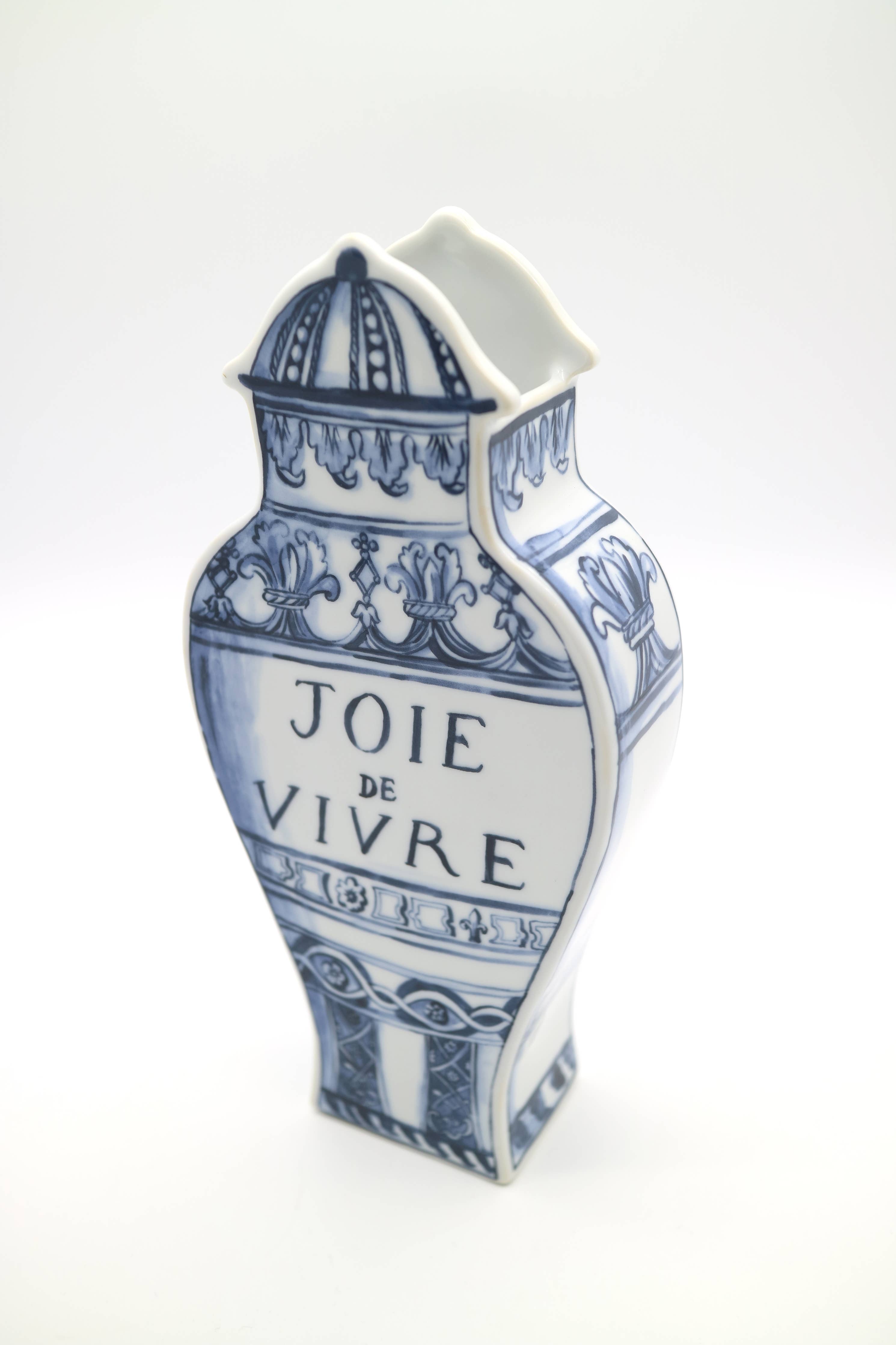 Ideal as a vase for flowers / One vase per box / Porcelain with hand decorated decal / Vase: 11 in. height / Well Versed Collection / Design collaboration with Molly Hatch