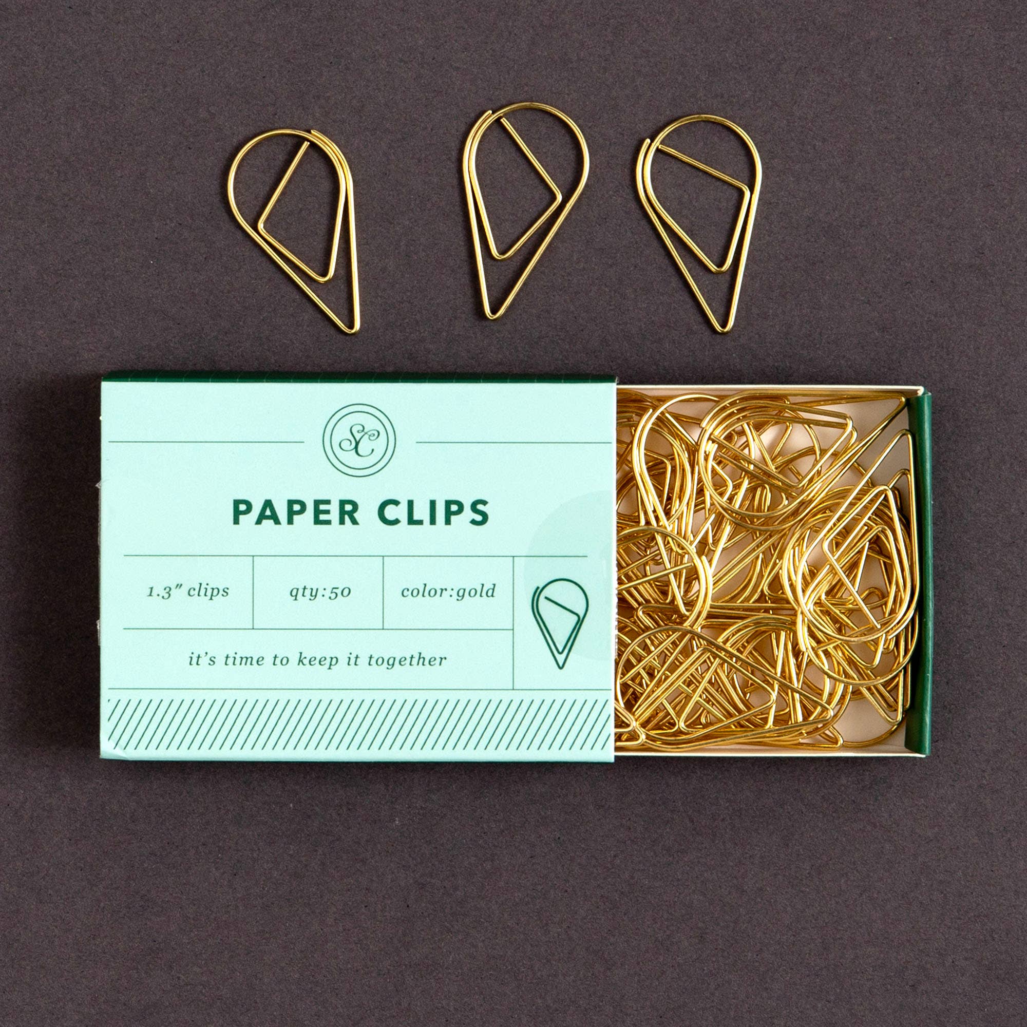 Keep it neat with a playful twist using the Keep It Together Paper Clips – Blue. This 50-pack of gold clips comes in a soft blue box with a clever message that’s as functional as it is fun. The unique teardrop shape adds flair to your everyday paper stacks, planners, or project boards—perfect for home offices, classrooms, or journaling setups. A stylish upgrade from standard clips and a charming little gift for students, coworkers, or stationery lovers who like to keep it all together (or at least look like it!). Features: 50 Paperclips in a sliding tray box Size: 3×2×0.4"; Paperclips - 1.3" length