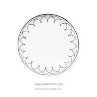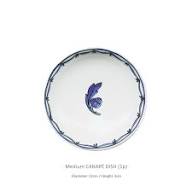 Each plate features a different design. The large plate features the Blue Bird border pattern. The medium sized plate has its own border with a leaf design in the middle. The smallest plate has a simpler border with a leaf in the middle. The hand applied decals are designed to have an embossed texture as if engraved for an added richness to the unique design. Ideally sized for snacks, tidbits and side dishes. Modern yet classic from the Blue Bird Collection by Twig New York. Dishwasher safe.