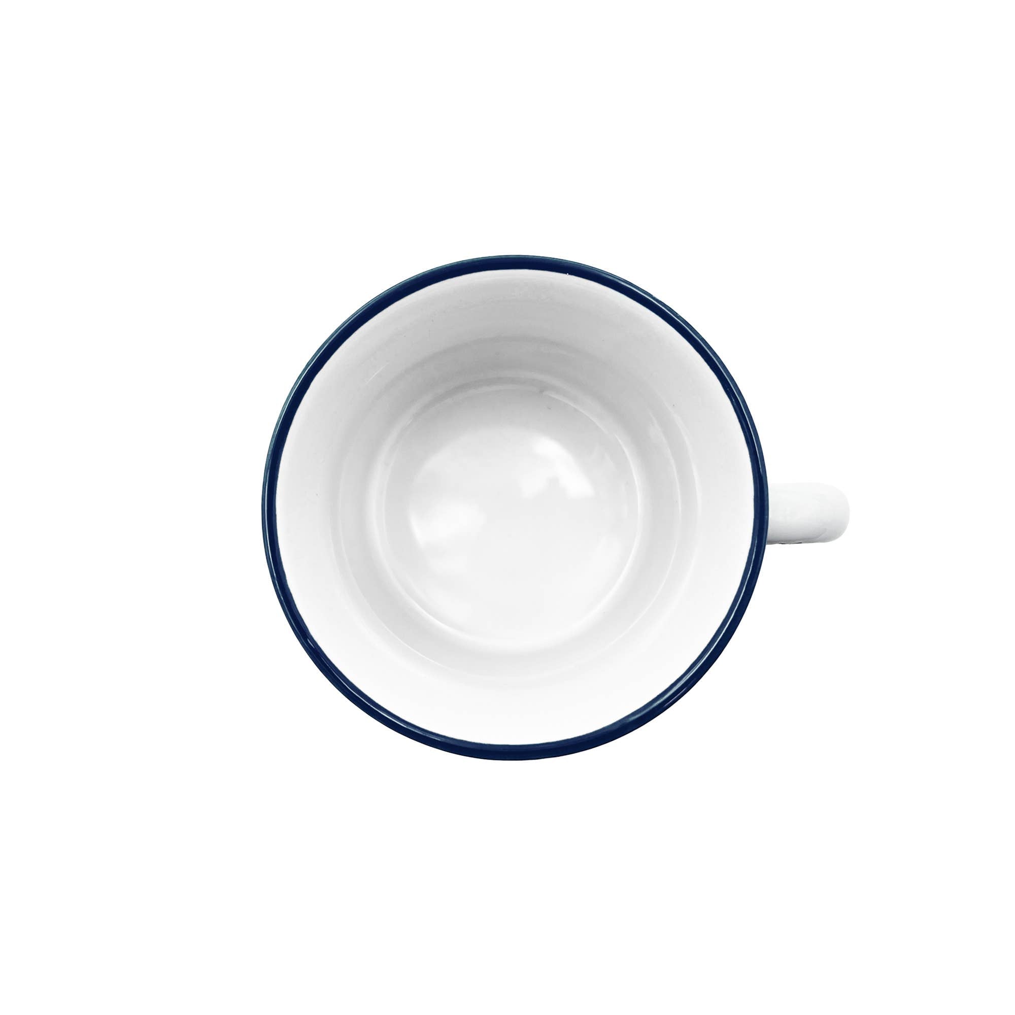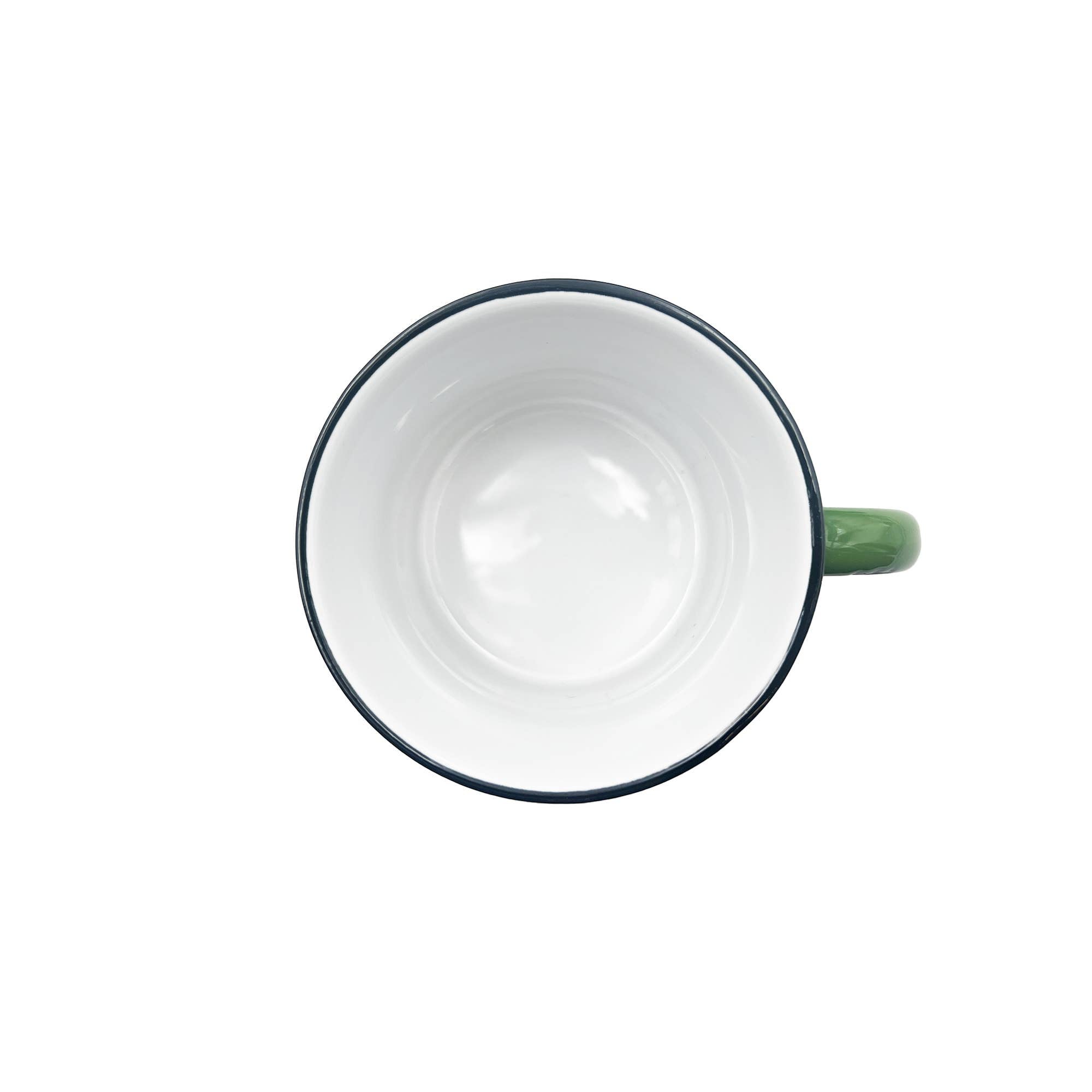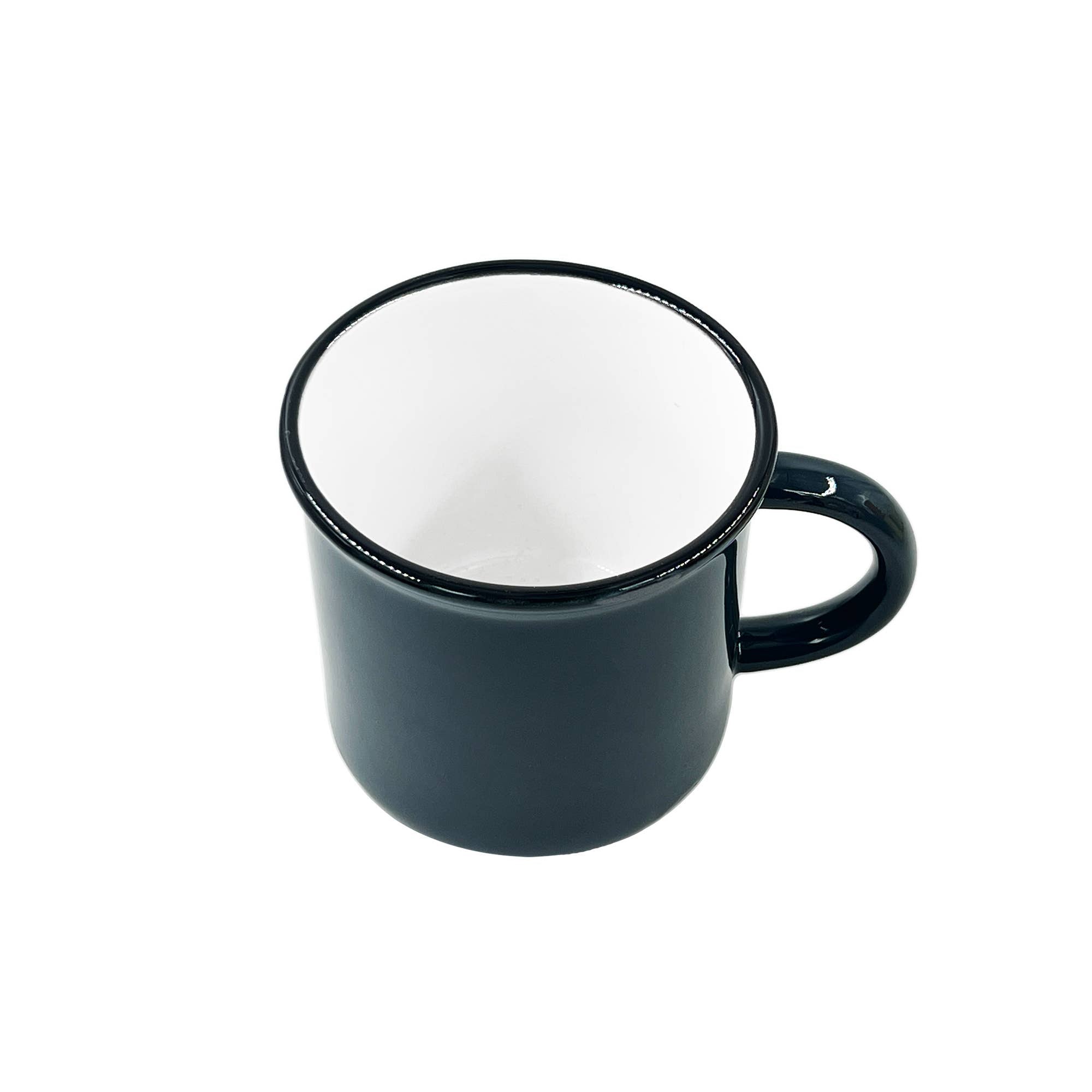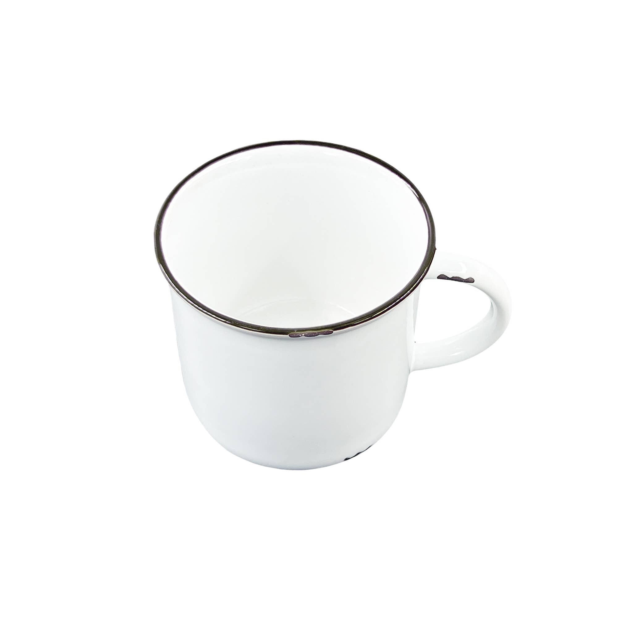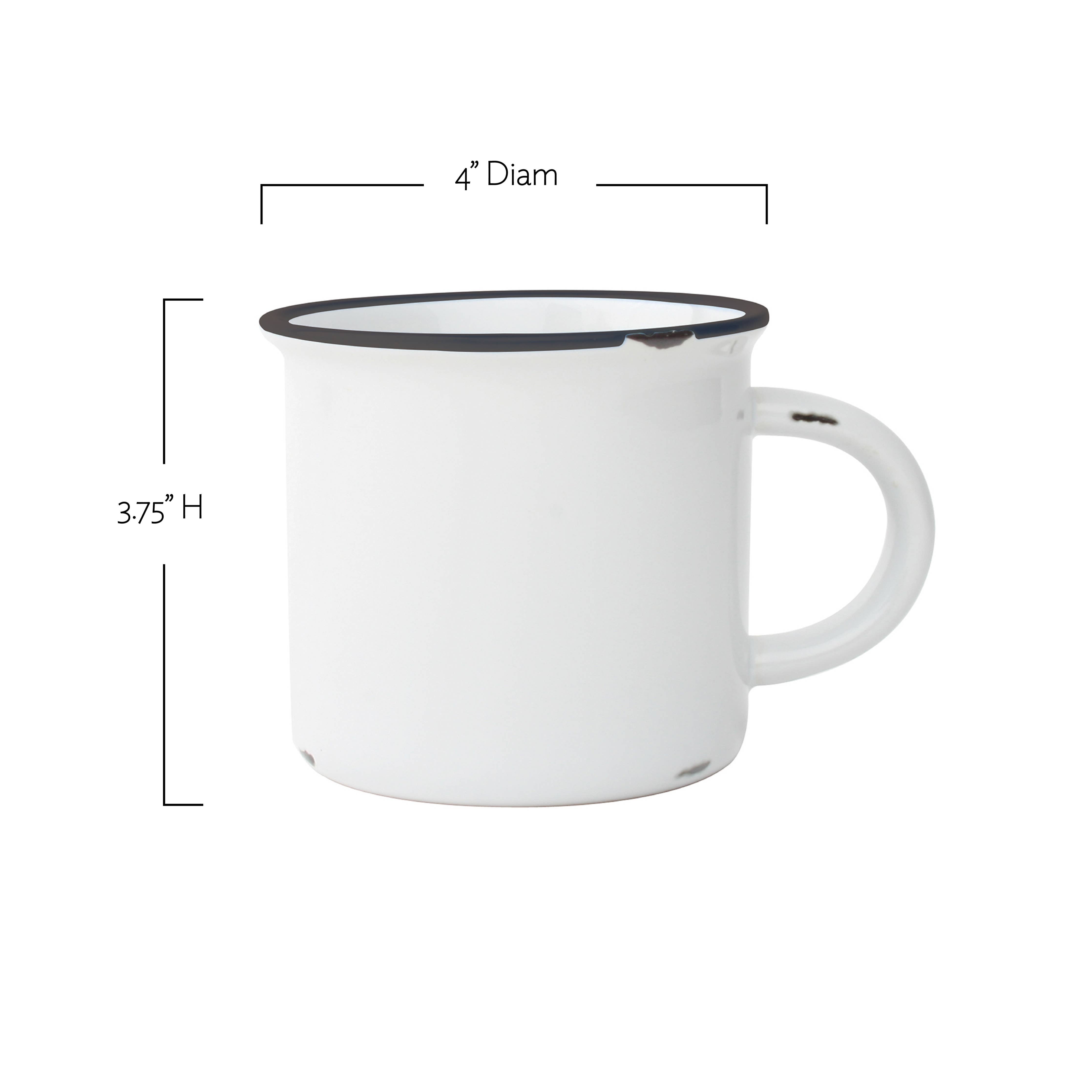 Tinware mug set winter: includes red, green, slate, and white w/ slate rim. Mimicking vintage metal cookware, the canvas home tinware collection is made of stoneware, complete with realistic distressed edges and a contrasting rim stripe. Heavy duty and functional for the modern home, this family has been top-seller year after year. Great for cookout gatherings or a nostalgic fireside evening with the family, there is no home for which this collection isn't a perfect fit. 4"L x 4"W x 3.75"H.