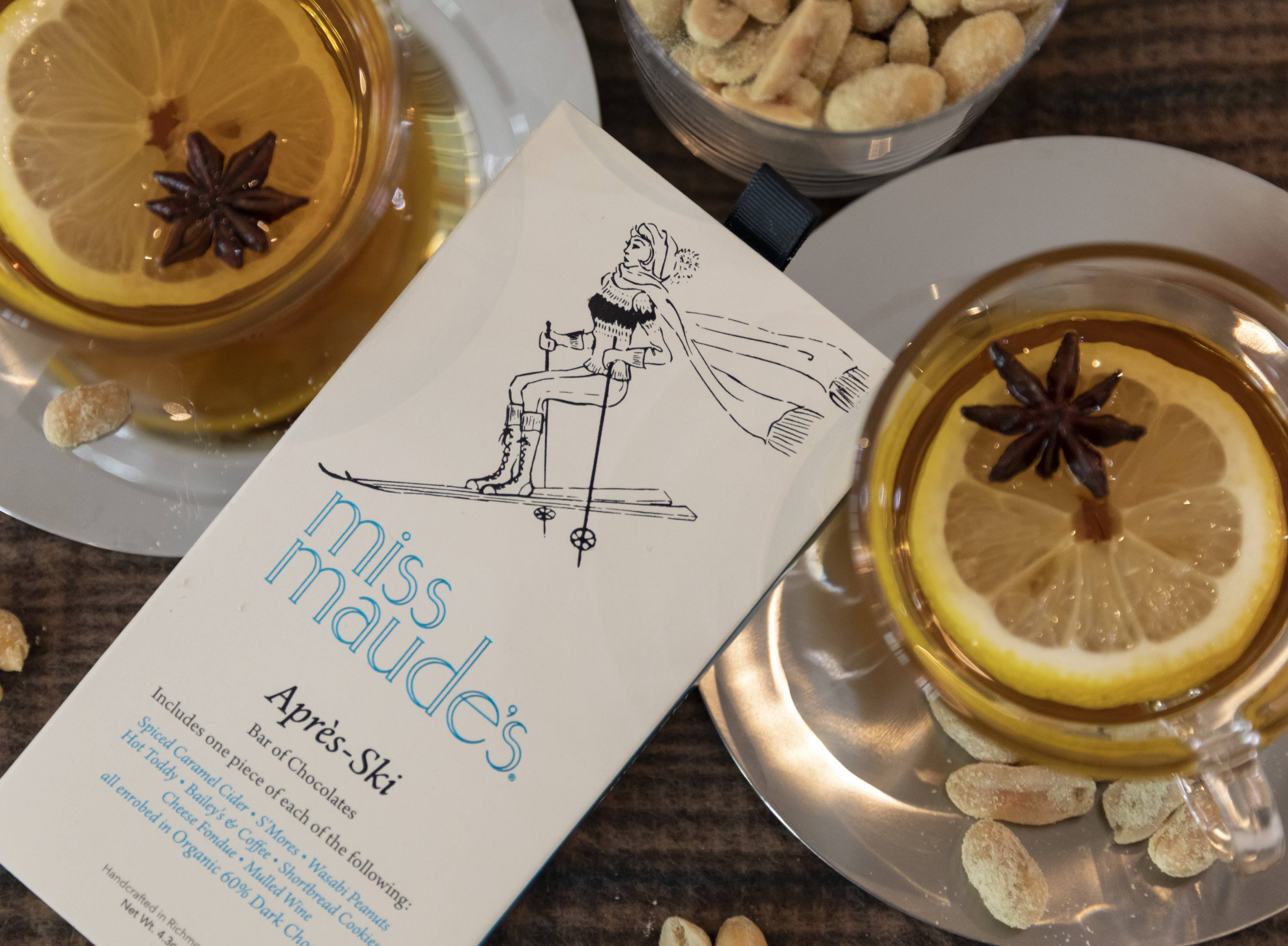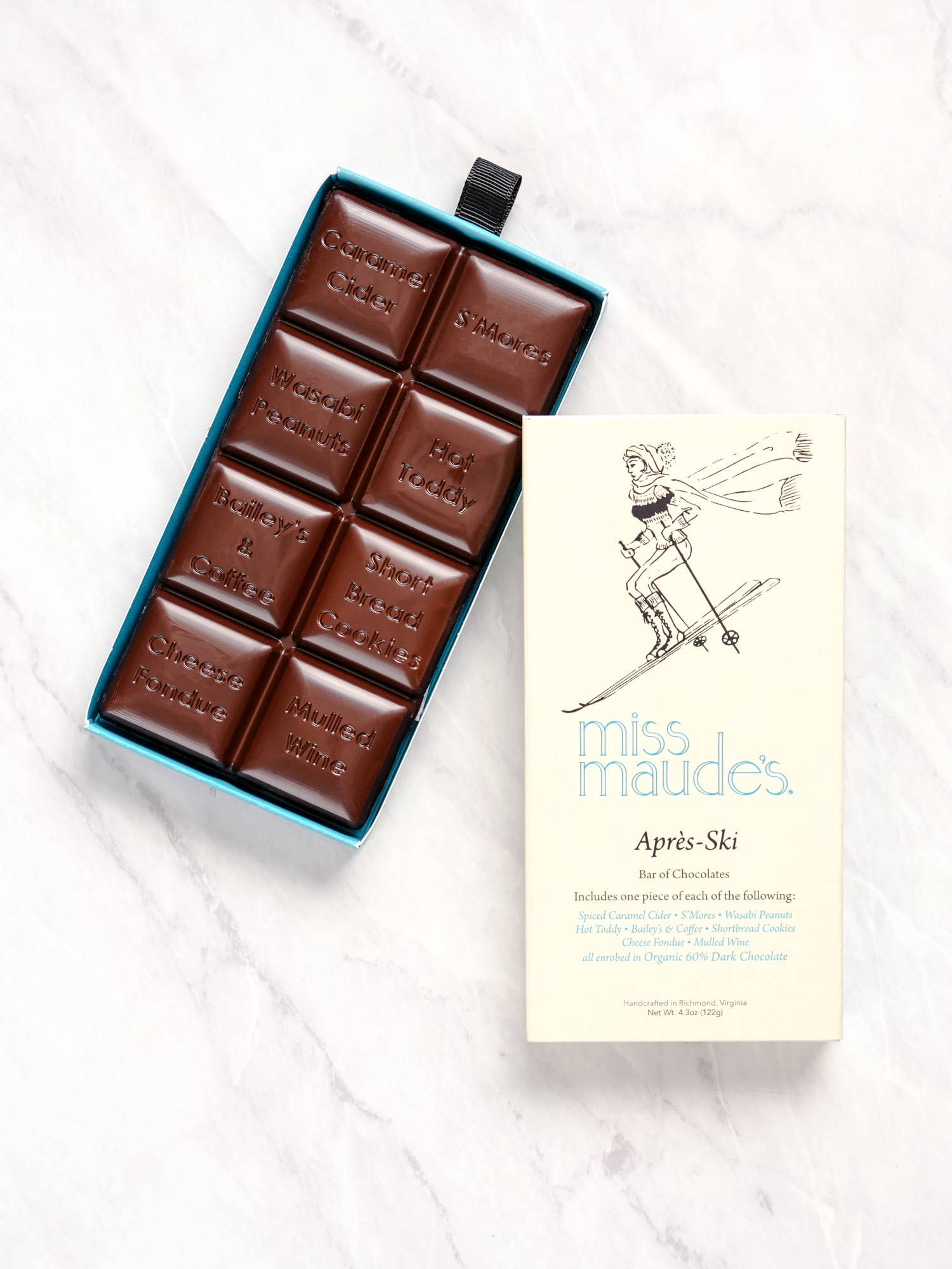 Whether you fancy hot spiced cider and s’mores by the fire, a hot toddy with wasabi nuts at the bar, mulled wine with cheese fondue in the chalet, or warm Bailey’s & Coffee with buttery cookies while watching people slide down the last run, Miss Maude has combined your favorite Après ski treats into one deliciously decadent chocolate bar.