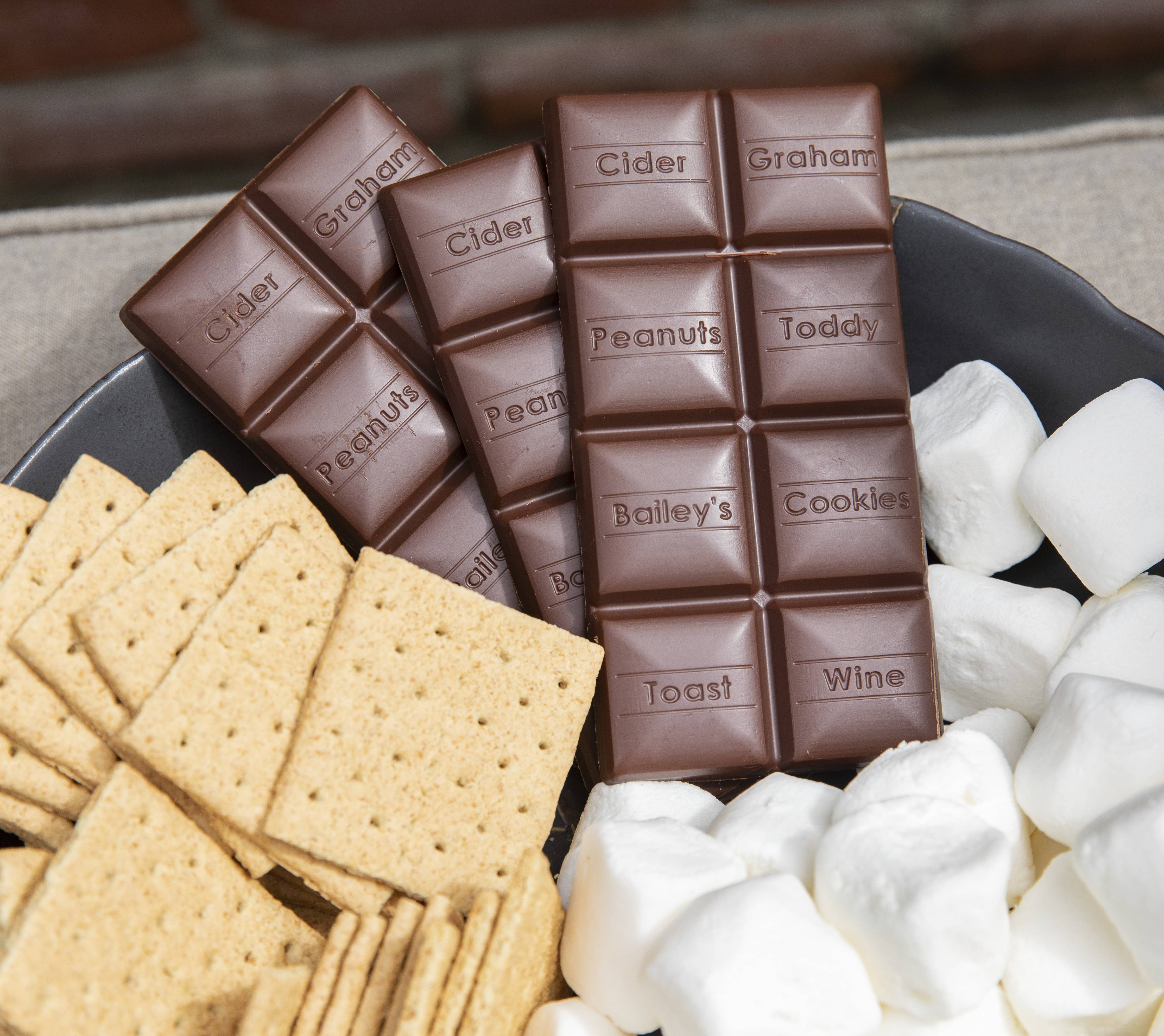 8 flavor chocolate bar: spiced caramel cider, s'mores, wasabi peanuts, mulled wine, bailey's & coffee, shortbread cookies, cheese fondue, and hot toddy, all enrobed in organic 60% dark chocolate.