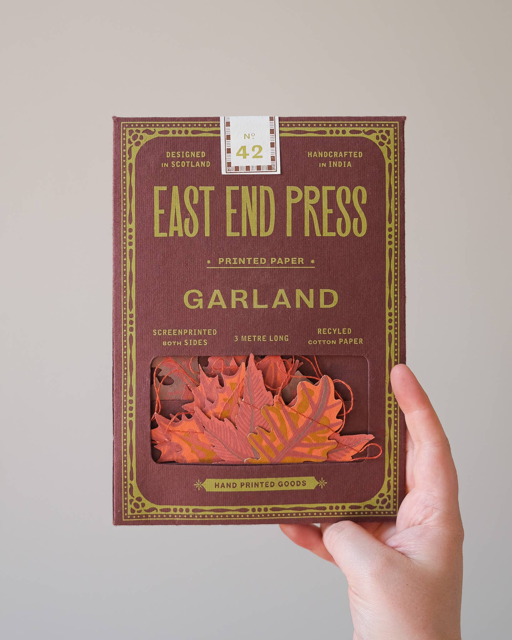 Perfect for Autumn lovers, this bunting has twenty leaves in rusty oranges, muted greens and rich ochres, ready to decorate your home ready for the cosiest season of the year. Minimum order: 6 - 3 metres long - Includes 10 paper shapes, sewn along strong cotton thread - Screen printed by hand on both sides by talented artisans in Jaipur - Sustainably made from recycled materials