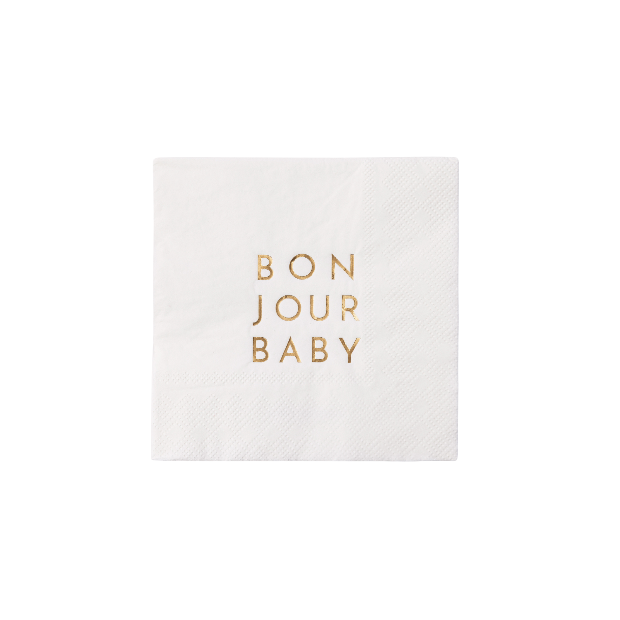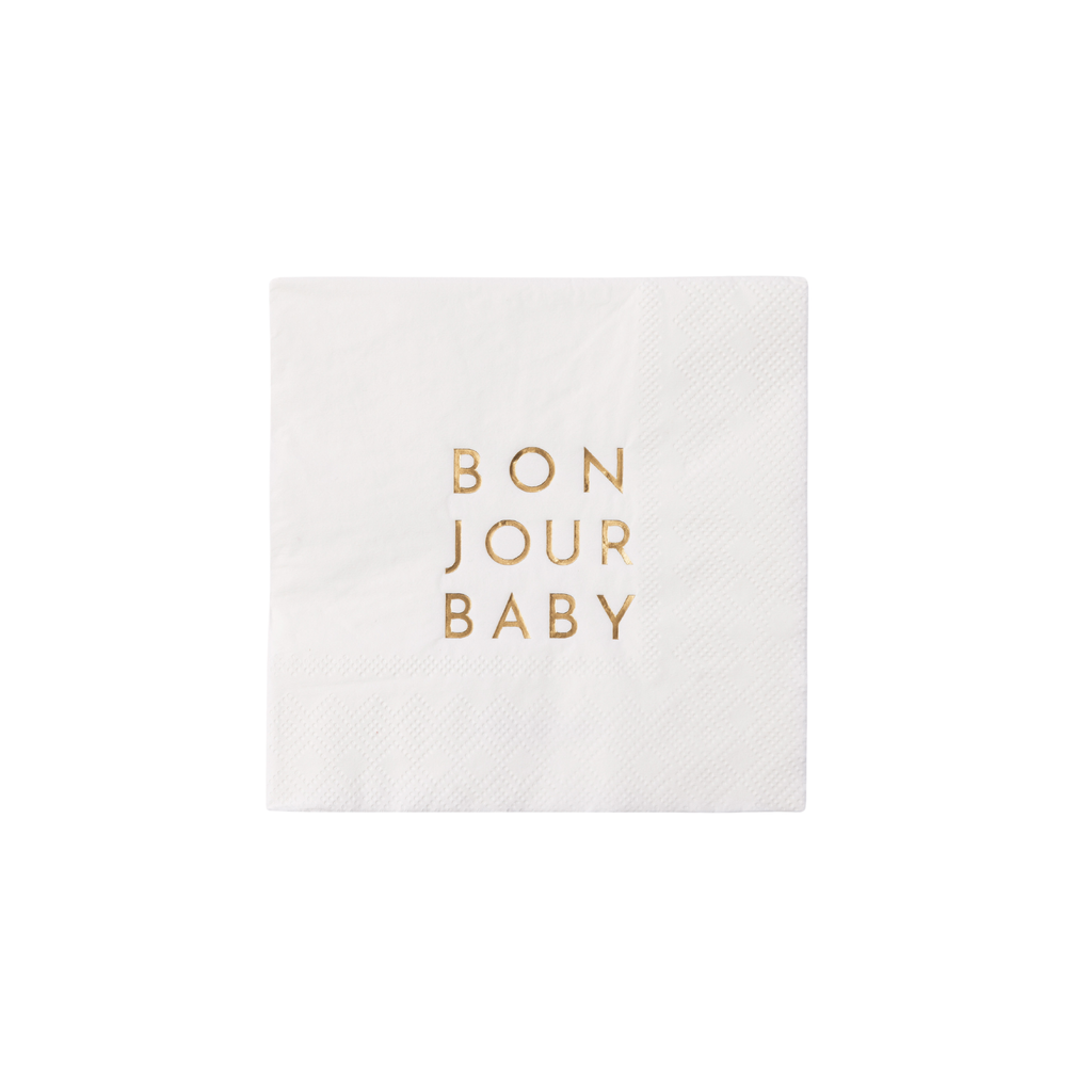 Our Bonjour Baby Blanc White Cocktail Napkins are the perfect accent to your baby shower party table. Adorned with sleek gold foil lettering, these modern French-inspired party supplies add a touch of sophistication to any baby shower celebration. Welcome, little one!