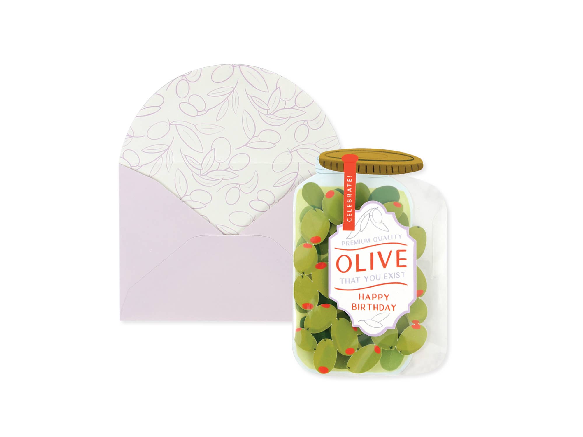 Our Dear Alchemy, Collection features curious and petite greeting cards with die-cut interactive elements. Insert the acetate tab into the slot on back to display a dimensional olive jar. Printed in full color and finished with neon Pantone orange ink. Lavender envelope with printed olive branch patterned interior Front copy: Celebrate! Olive that you exist / Happy Birthday Fits inside 5″ L x 3.5″ W mailable envelope
