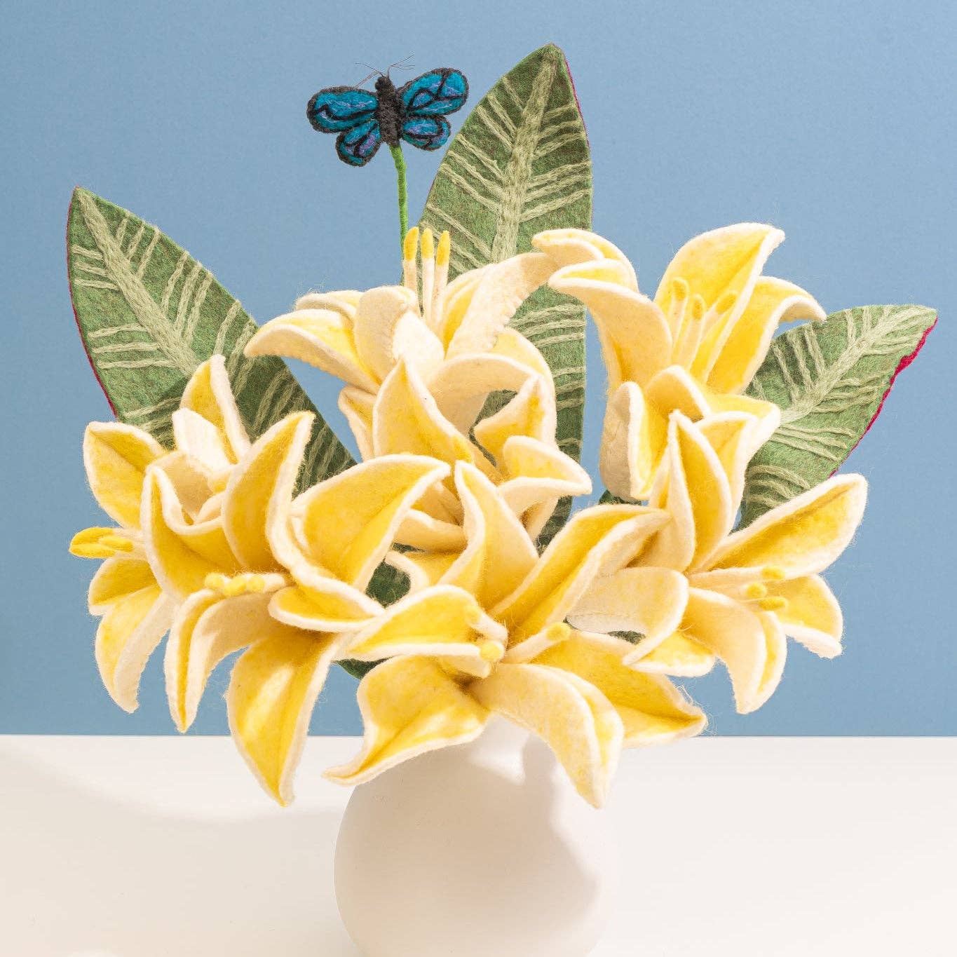 Celebrate spring's most iconic bloom with our handcrafted Easter Lily Bouquet! Soft yellow lilies with delicate white edges nestle among lush green leaves, topped with a cheerful felt butterfly. Each piece is meticulously handfelted by women artisans, capturing the graceful beauty of Easter lilies that symbolize renewal and hope. This arrangement brings seasonal elegance to your home without the wilting or maintenance. Perfect for Easter celebrations, spring décor, or gifting to someone special.