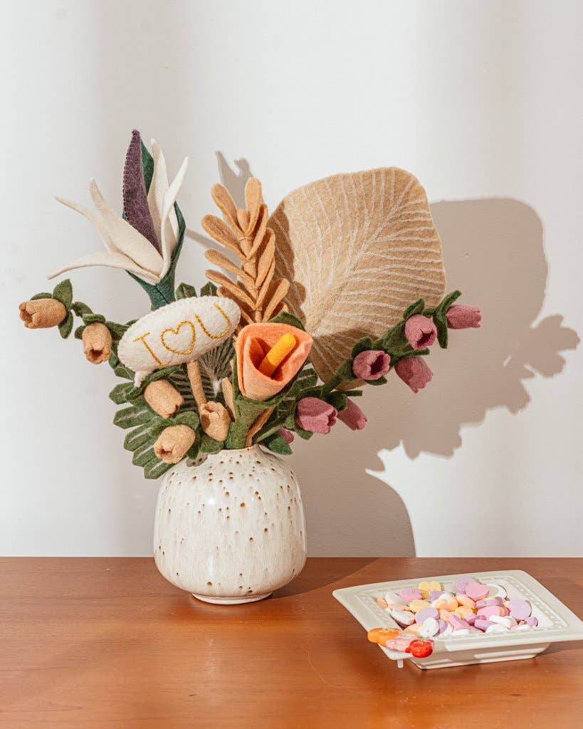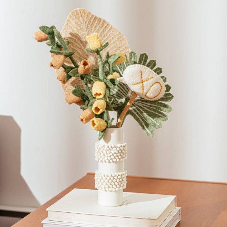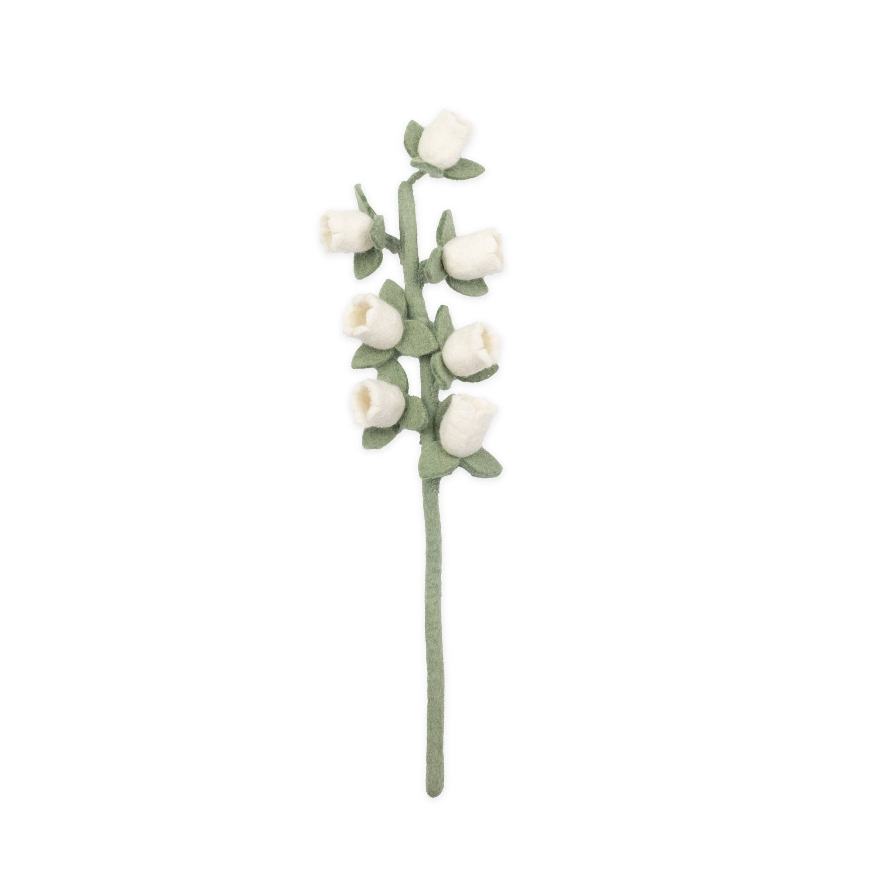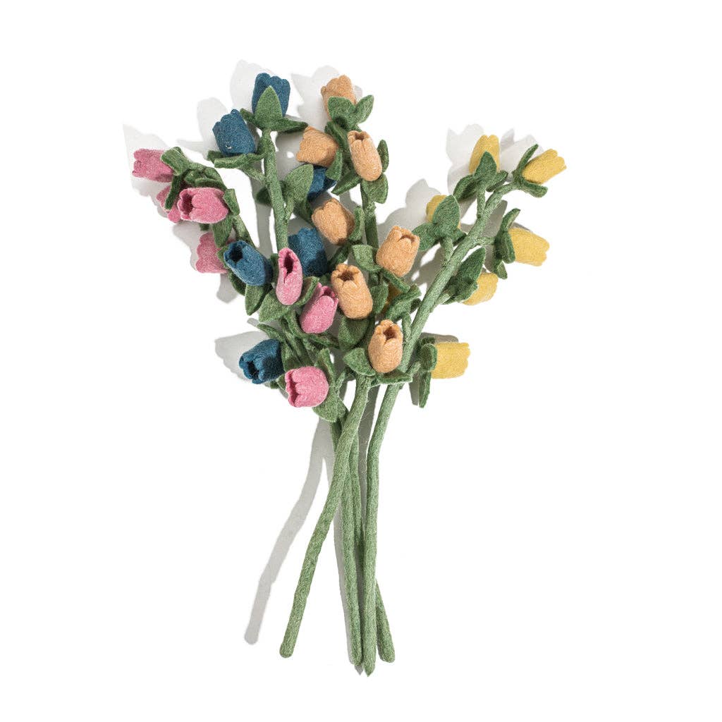 The beautiful Felt Bellflowers are a soft, subtle and sweet addition to any bouquet, or bundled together by themselves. Made with felted wool by artisan women in Nepal, the Bellflowers feature seven buds each, strung along a soft green bendable stem. Display them in a Tall Vase to show them off. Felted Wool, bendable wire stem Azo-free dyes, eco-friendly and non-toxic 18" tall x 3" wide