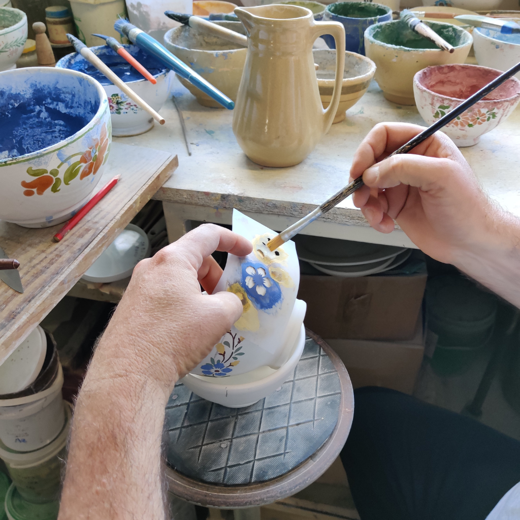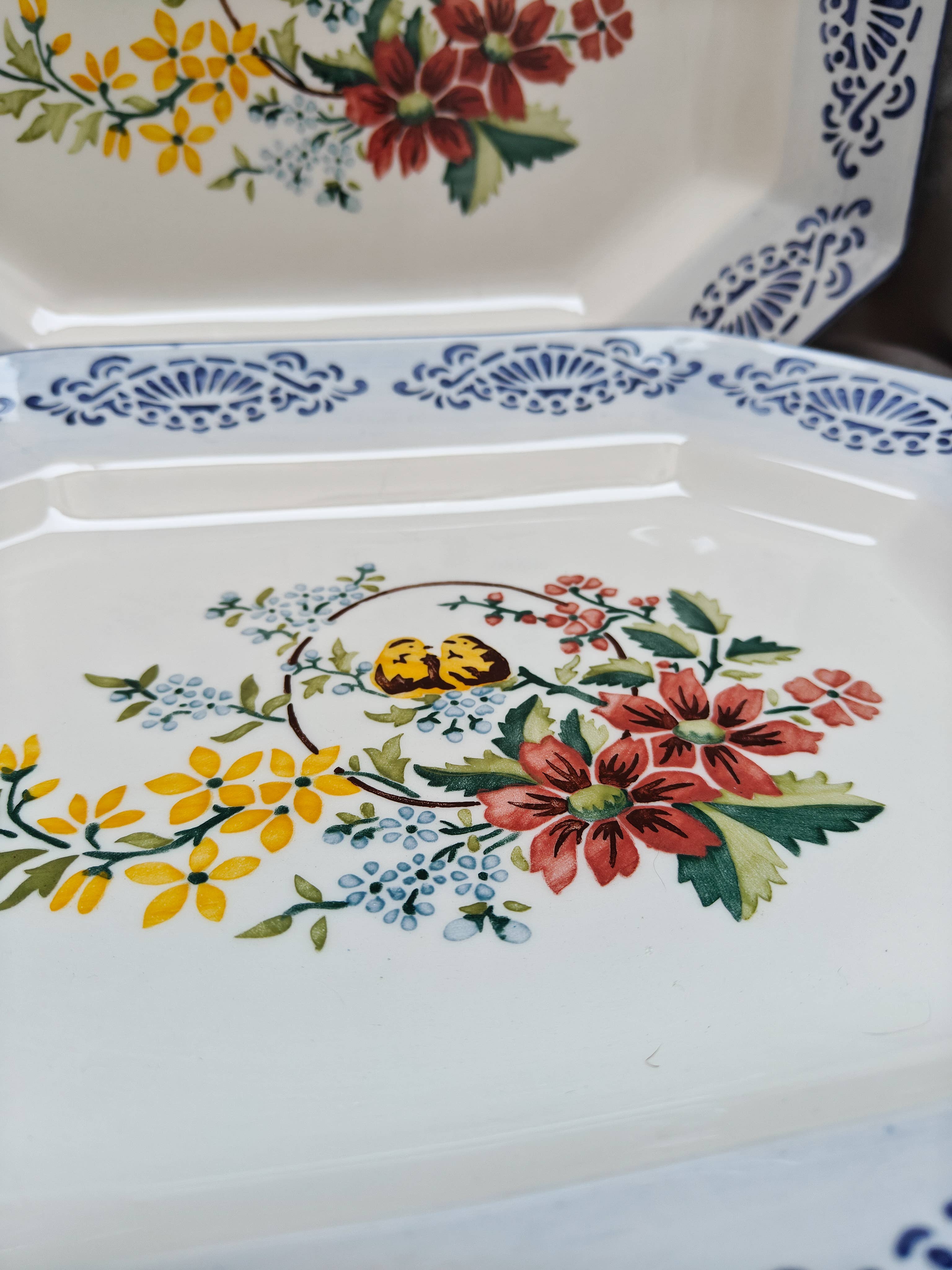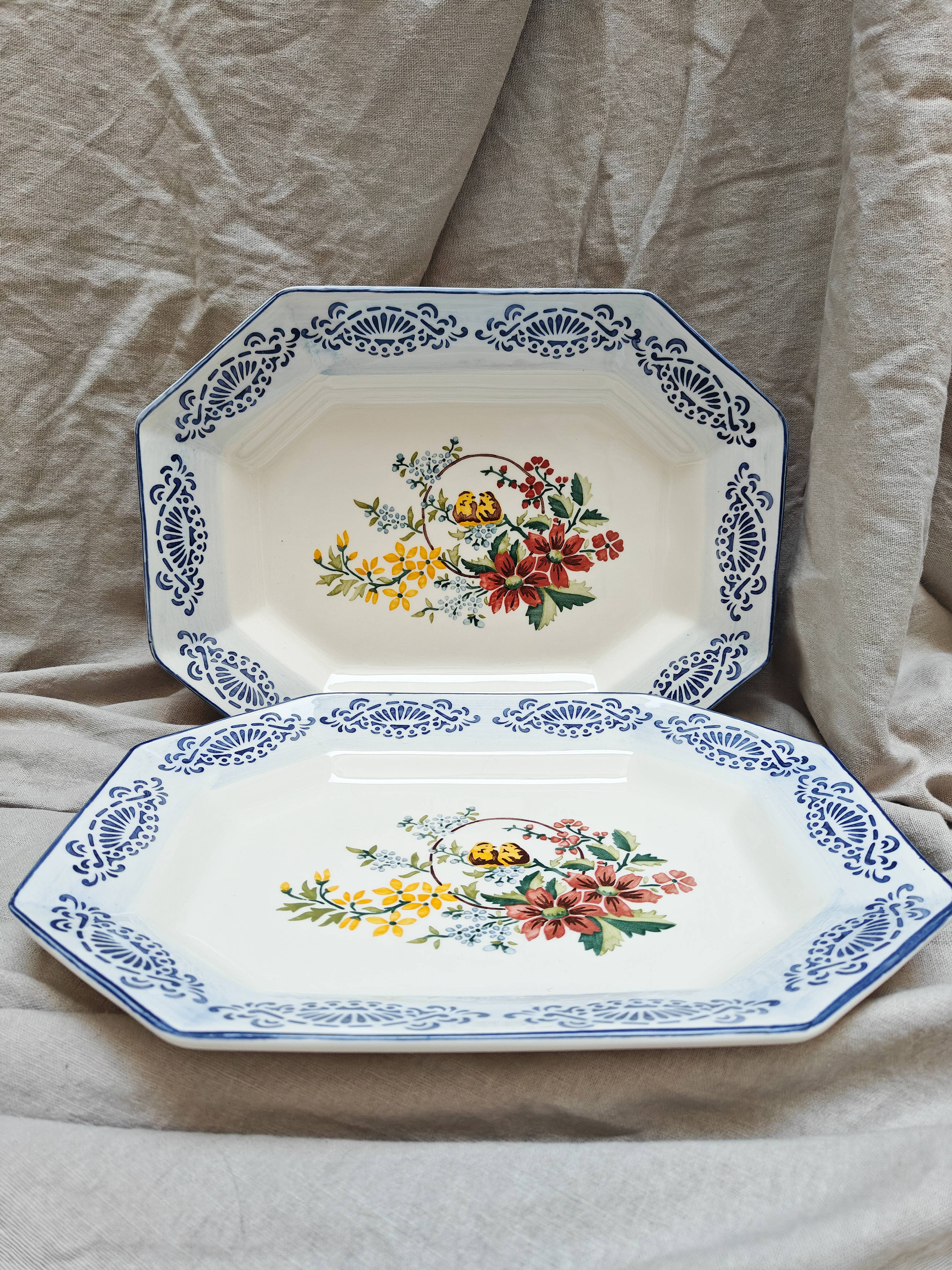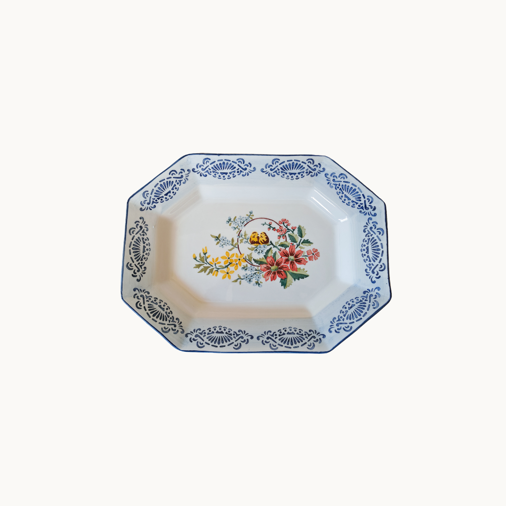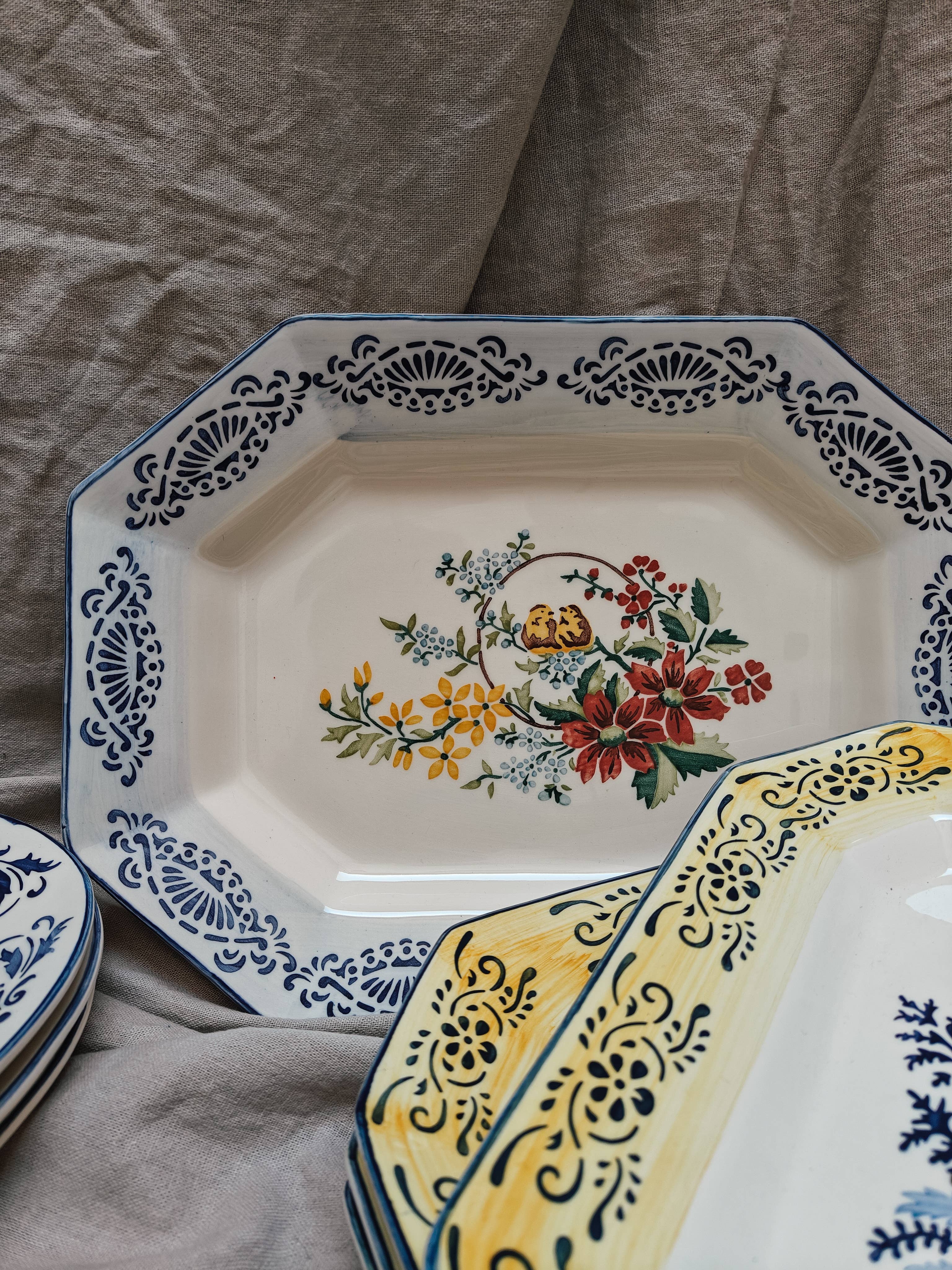 Portuguese octagonal platter handpainted by Jorge using reissued stencils. We loved these nestled birds surrounded by flowers and we combined them with a brushed rim in light blue with a geometrical border in deep Portuguese blue.