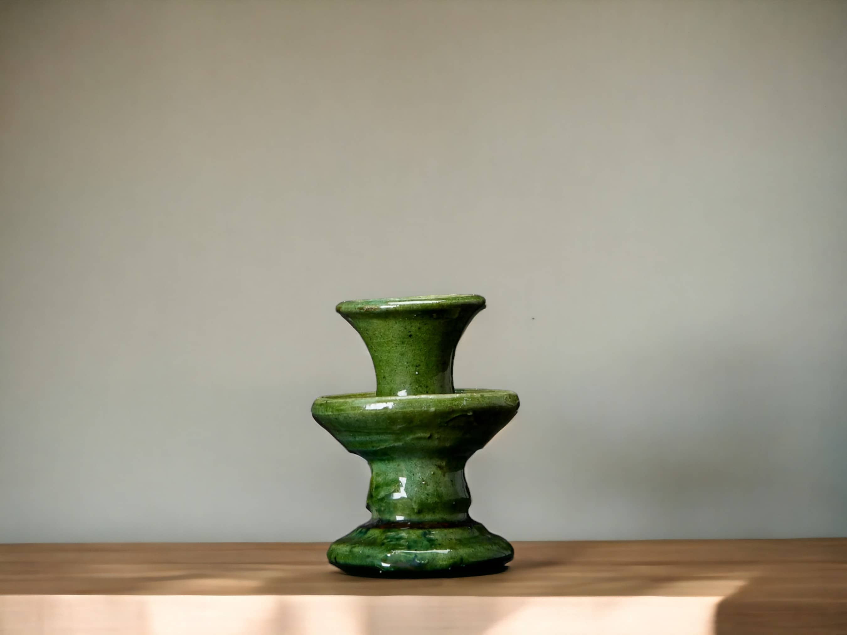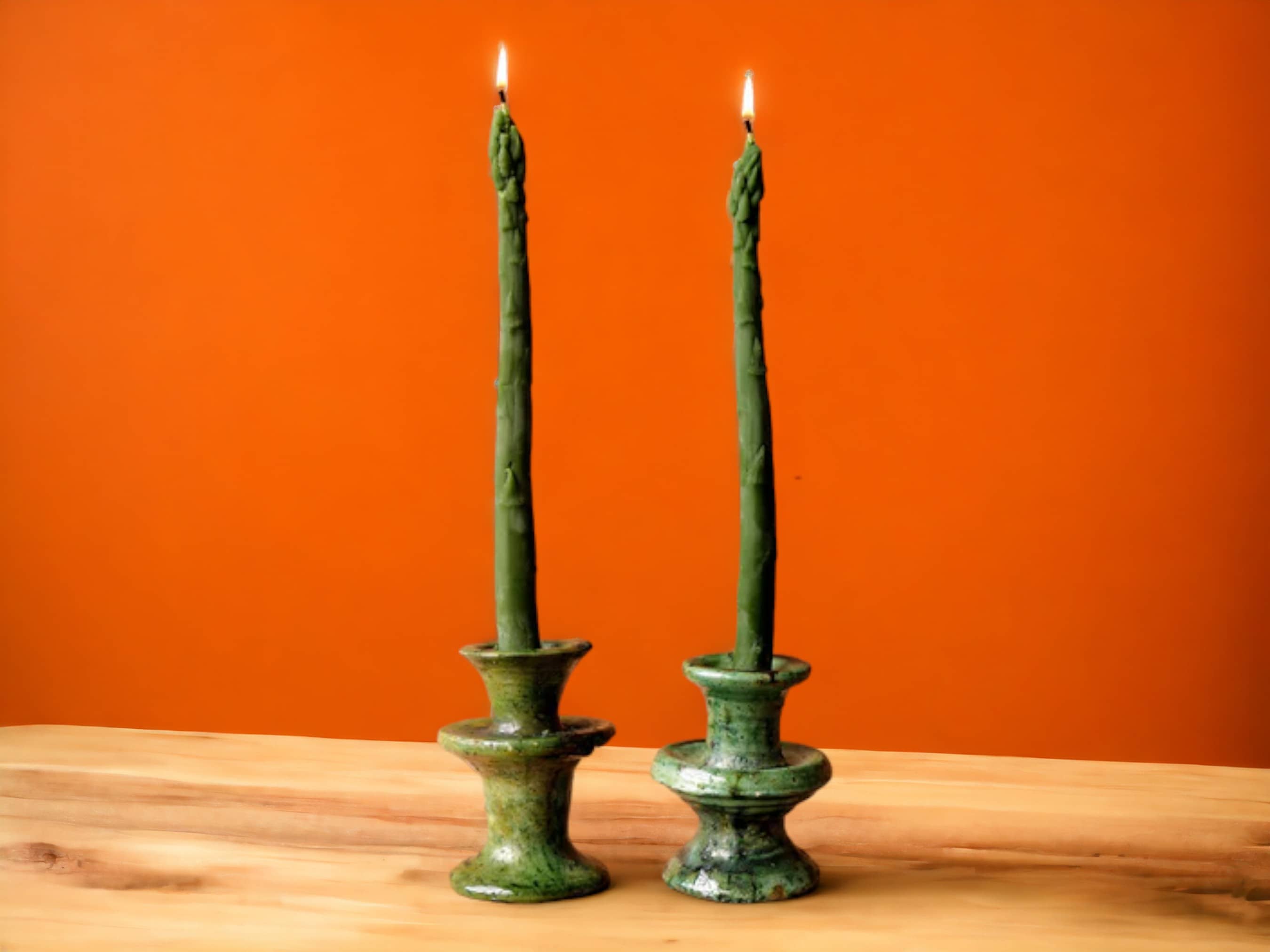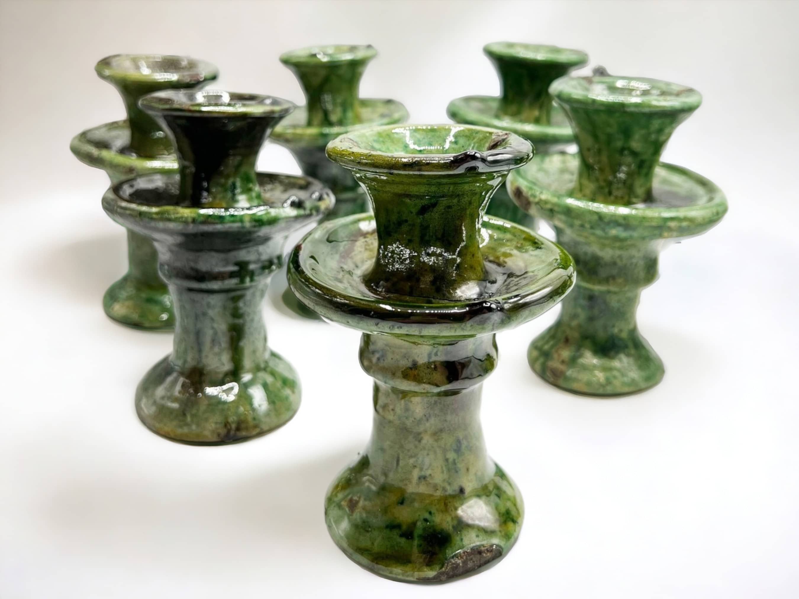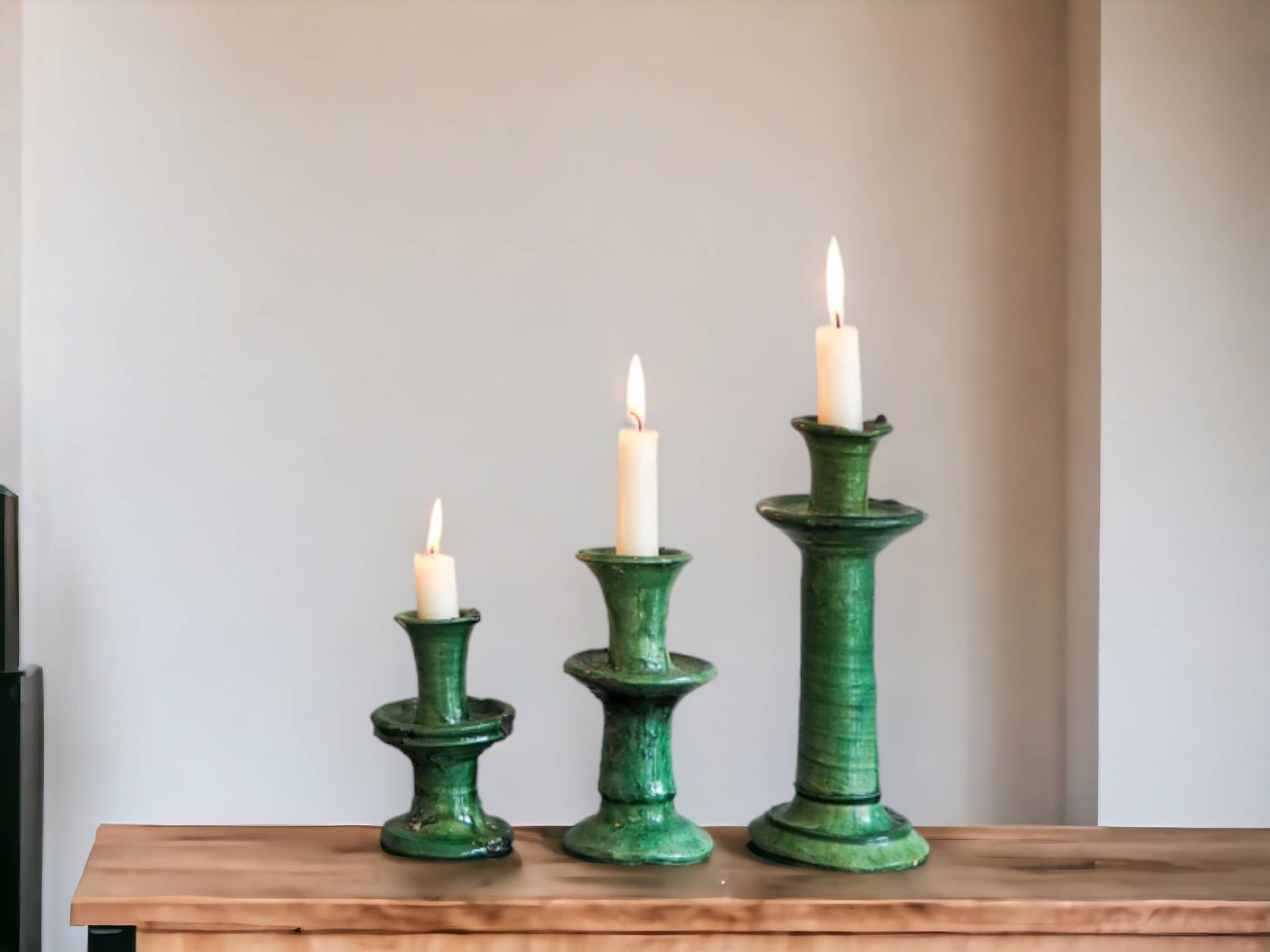 Explore our captivating collection of Tamegroute pottery, handcrafted with love in the quaint village of Tamegroute, Morocco. Illuminate your dining experience with our set of three vintage Tamegroute green candlestick holders, each one a unique masterpiece. Crafted by skilled artisans, these candlesticks boast a distinct tapered shape, lovingly formed by hand. The mesmerizing mid-toned green hue is achieved through a special glazing technique, making each piece a work of art. Approximate Dimensions (cm): Extra small : 7-10 cm Small : 15 cm Medium : 20 cm Large : 25 cm Extra large : 30 Approximate Dimensions (Inches): Extra Small: 2.8–3.9 in Small: 5.9 in Medium: 7.9 in Large: 9.8 in Extra Large: 11.8 in ⚠️ Please note: Tamegroute pottery is famous for its rustic charm, featuring minor imperfections such as baking marks, fine lines, and sometimes small treated chips — all of which add character to each unique piece. If you are looking for a perfect, machine-made pottery item, this pottery type is no