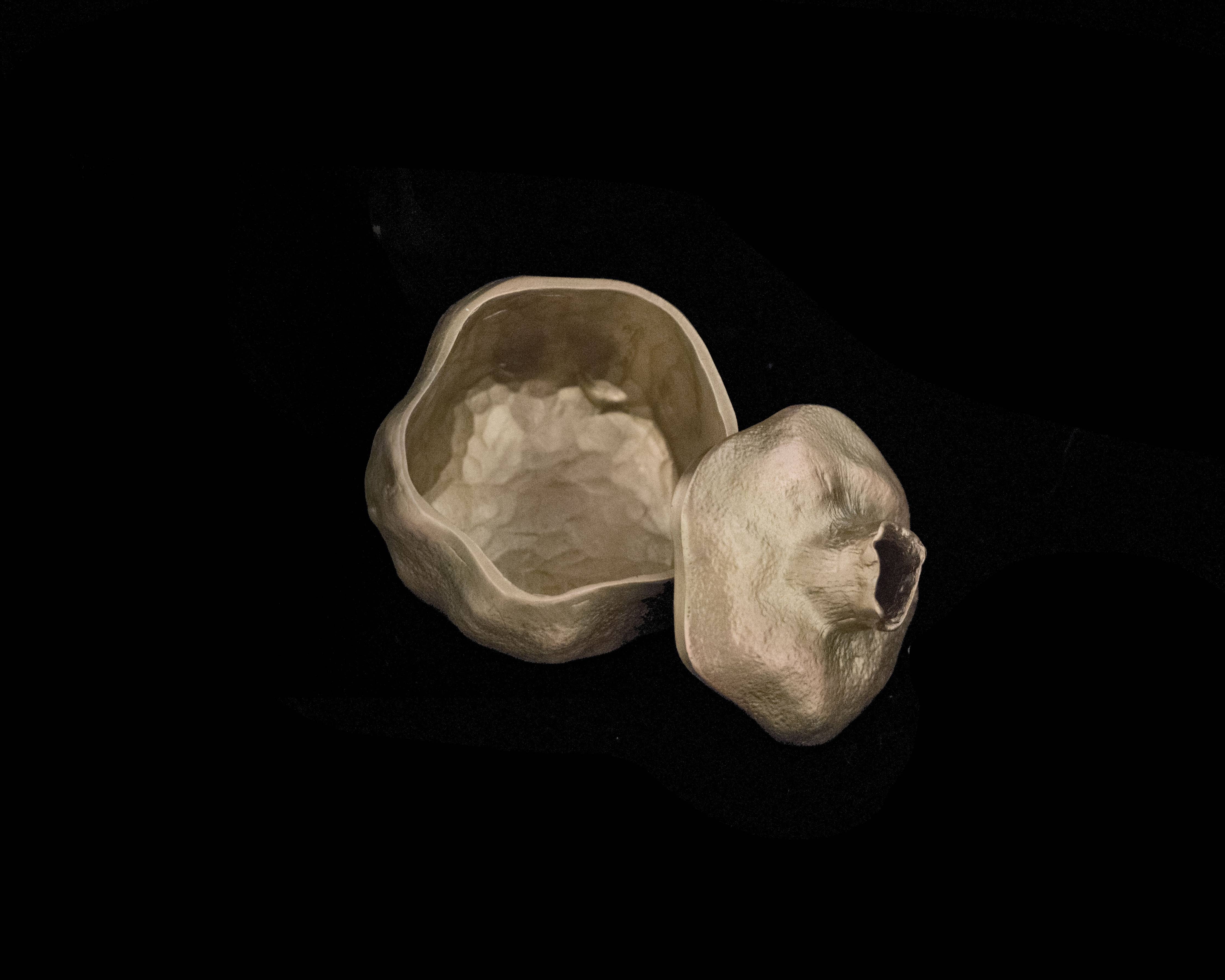 Measures: 1.75X2" cast in pewter with an antique pewter finish. Ideal containers for treasures or, whatever strikes your fancy! Hand wash with soap and water only.