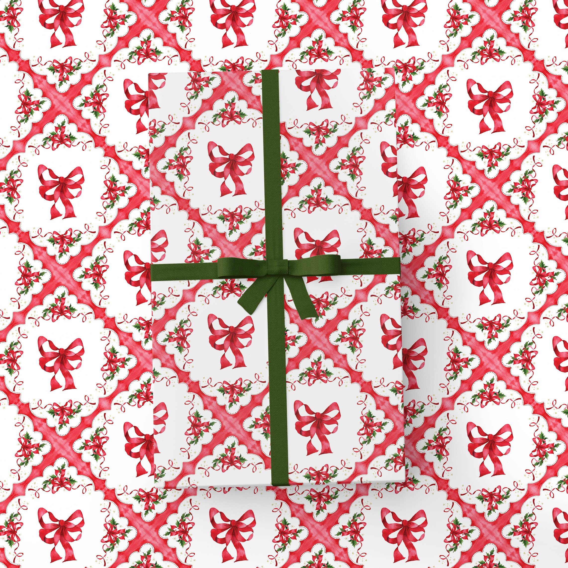 Wrap your gifts in a ribbon-tied dose of nostalgia! Our Vintage Bows Wrapping Paper is inspired by classic mid-century holiday tablecloths — the kind your grandma lovingly pulled out every December, complete with scalloped edges, holly sprigs, and candy-red ribbons galore.