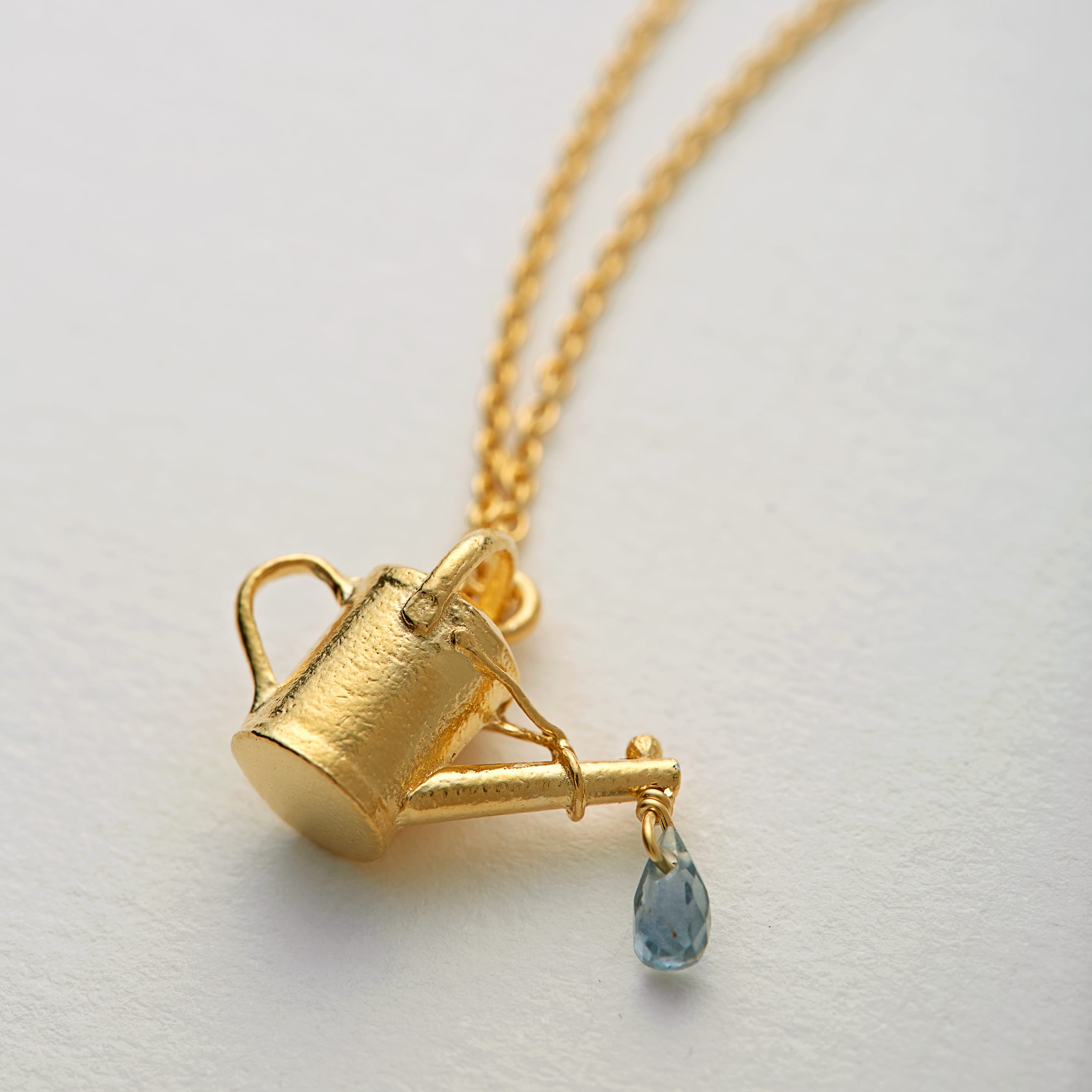 A blue sapphire 'droplet' is ready to fall from the spout of our Watering Can Necklace! Alex Monroe Jewellery is inspired by nature and handcrafted in our London Workshop.