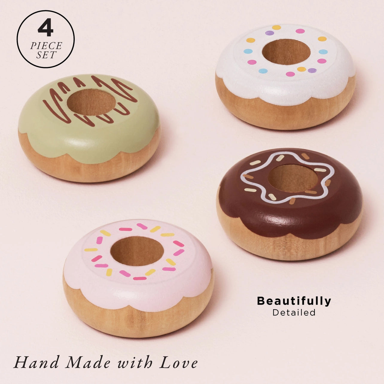 Tempt tiny imaginations with this wonderful set of four delicious wooden doughnuts.